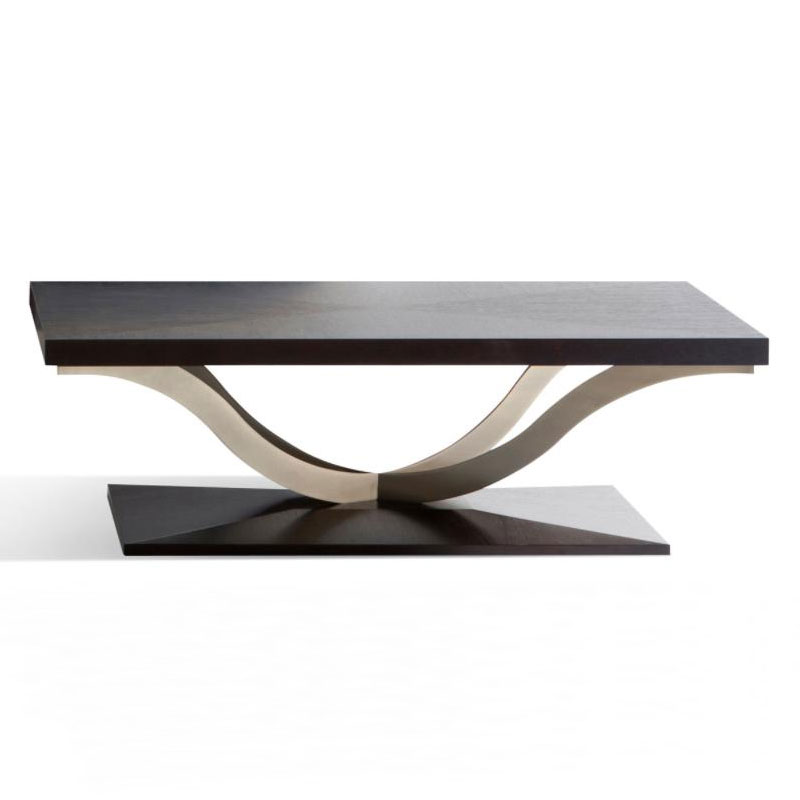 An undulating metal base delicately supports the rectangular, solid wood top and gives the Teseo small table a sophisticated, retro air.