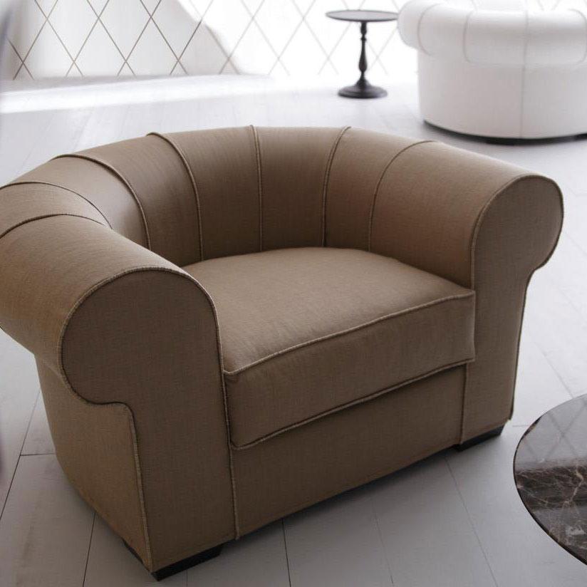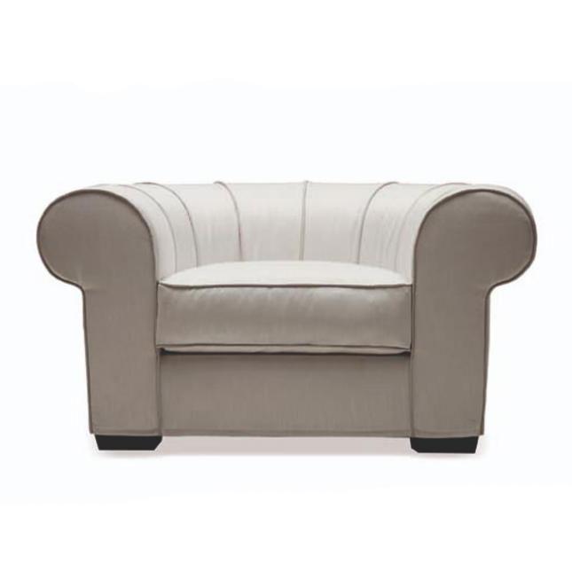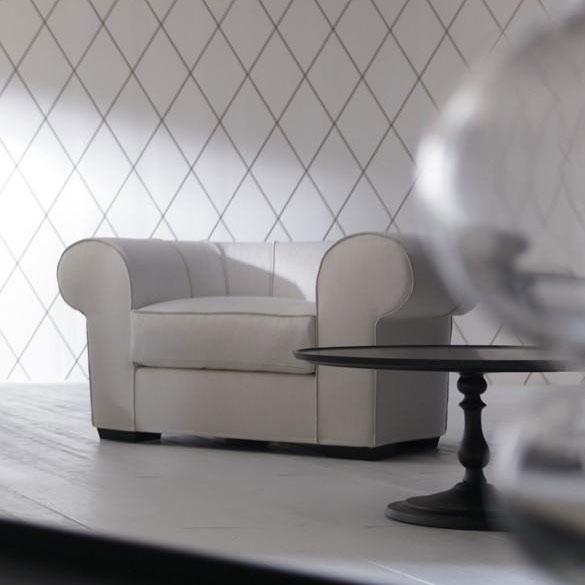 The traditional-looking Fedora collection has an unusual feature: arms and a back forming a single piece that wraps around the seat and is enriched with a soft filling. The wooden frame remains invisible but creates a sturdy, geometric style.