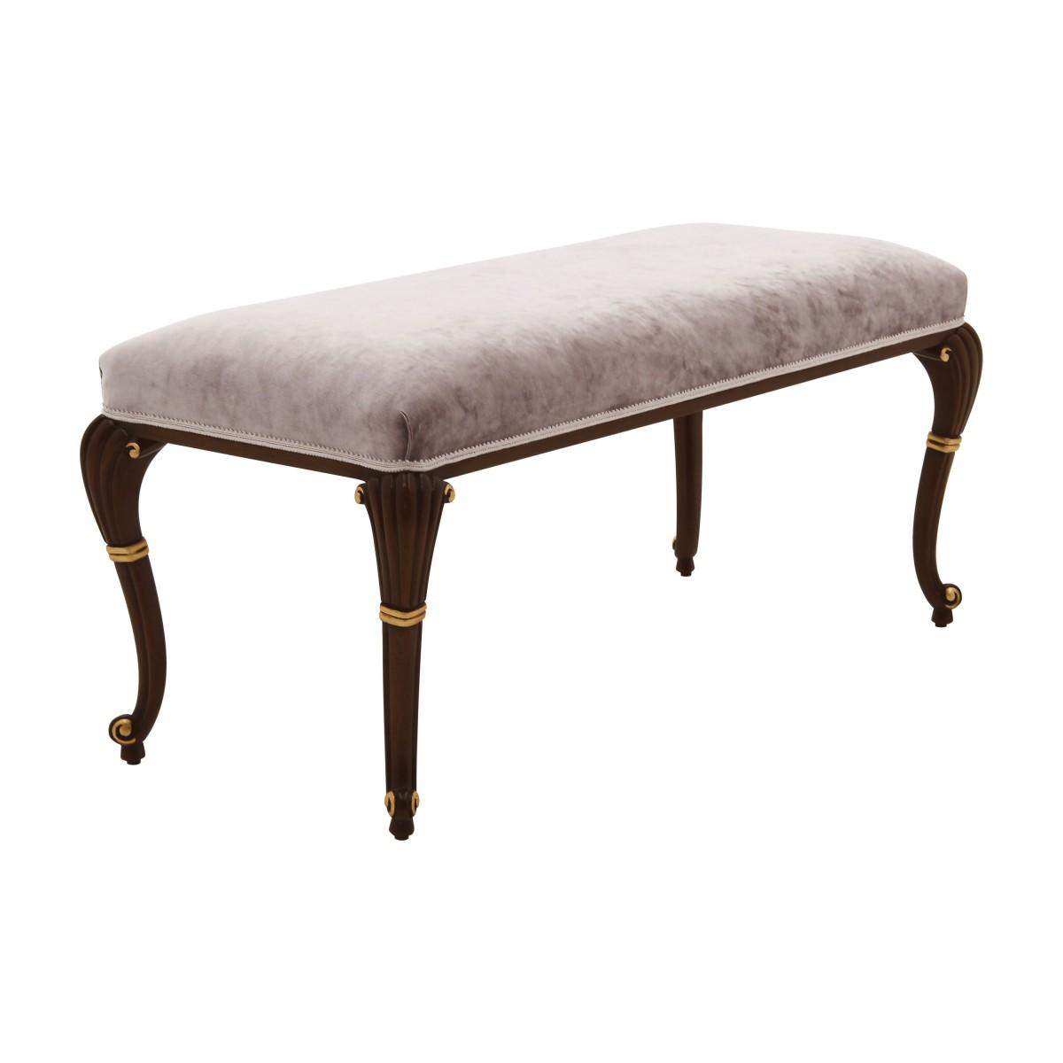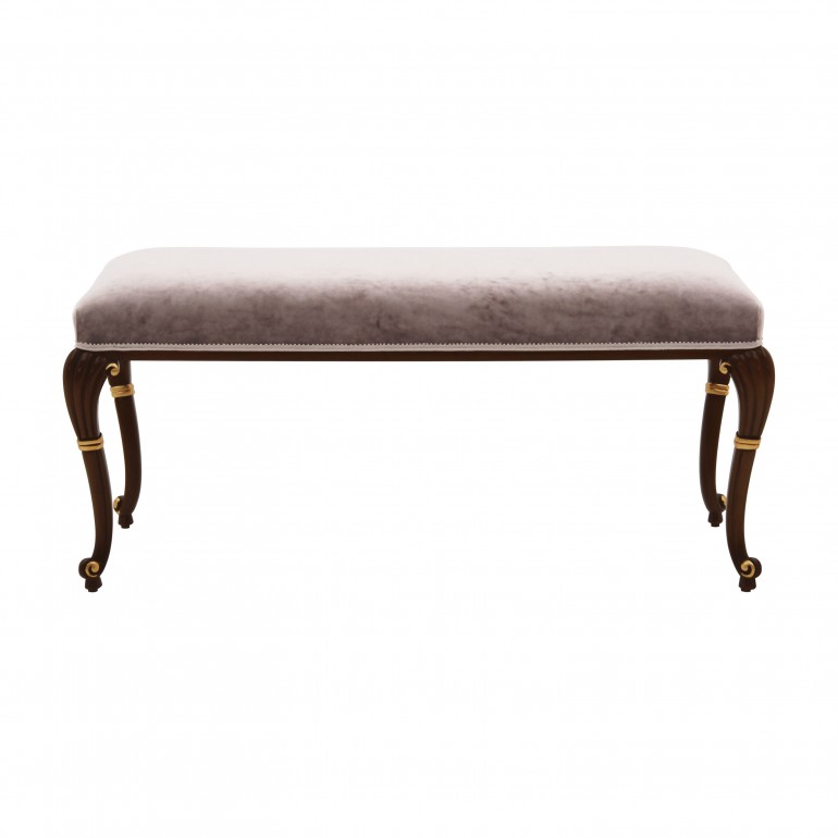 Elegant classic style bench with beech wood structure. The legs feature details that can be enhanced with a gold or silver leaf lacquer finish. The seat is padded with non-elastic webbing and superior quality foam. The upholstery can be customized with nails, braiding, double welt or welt.