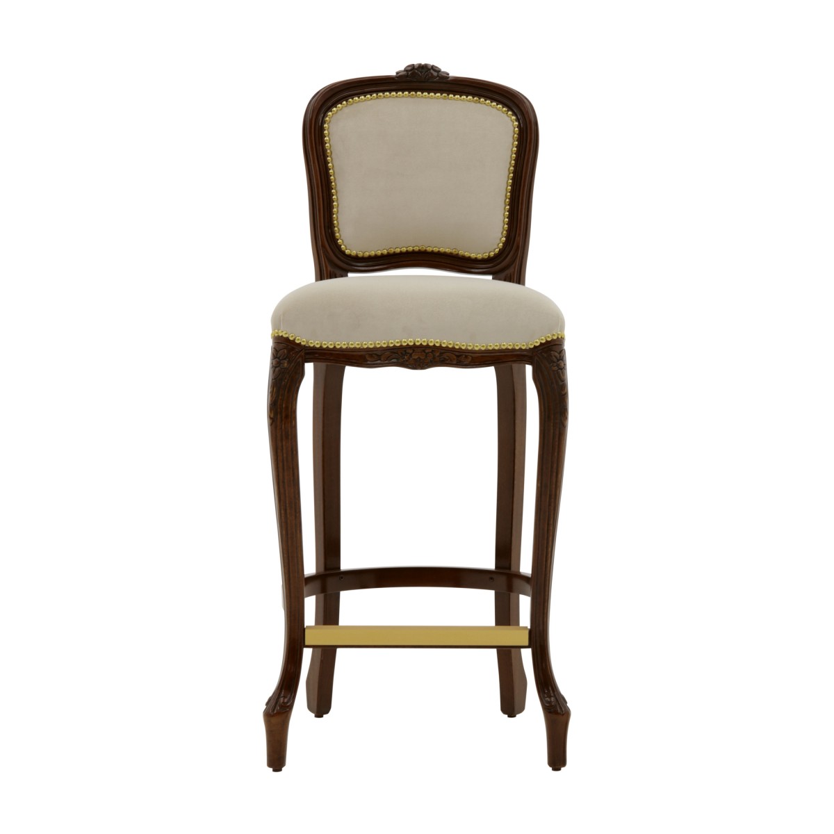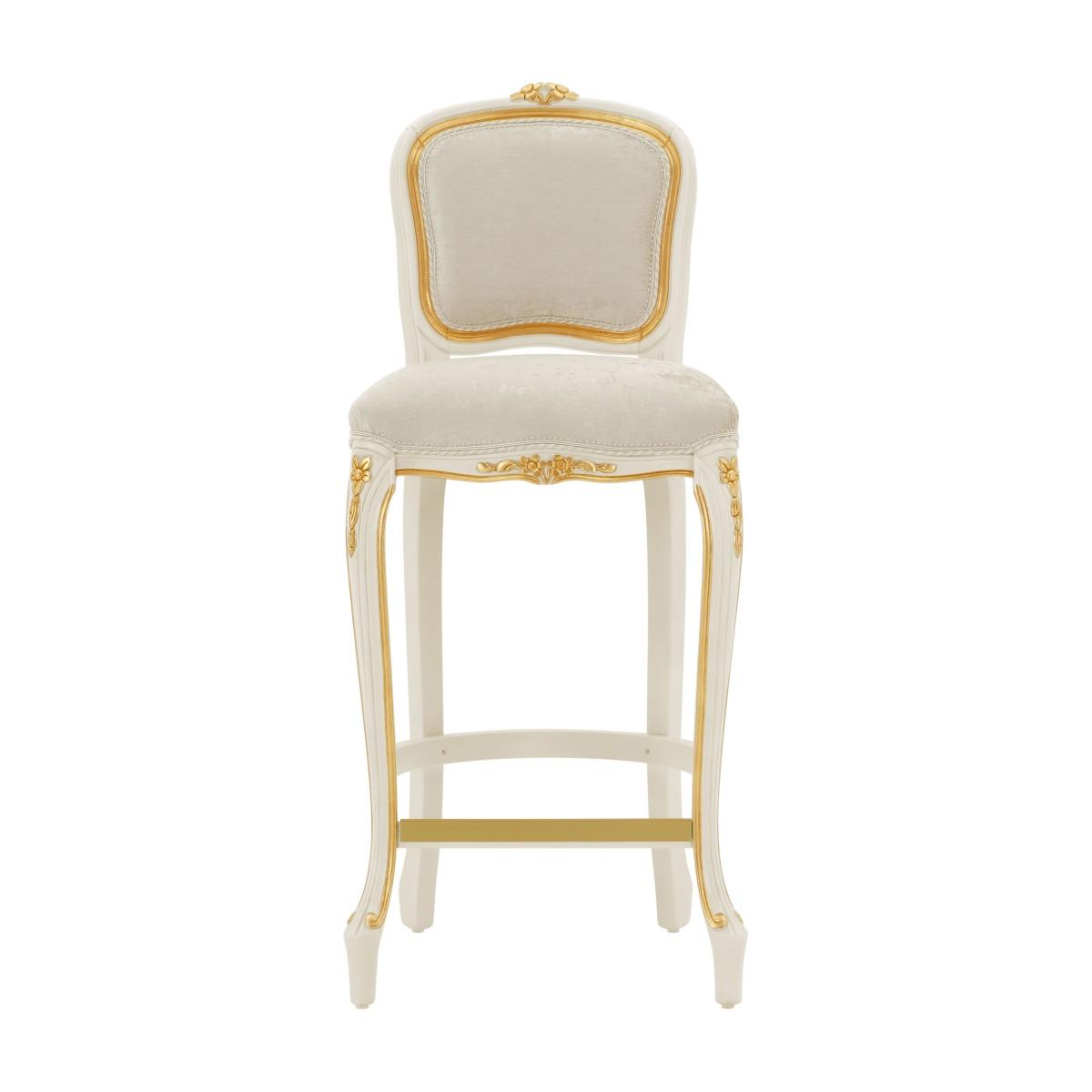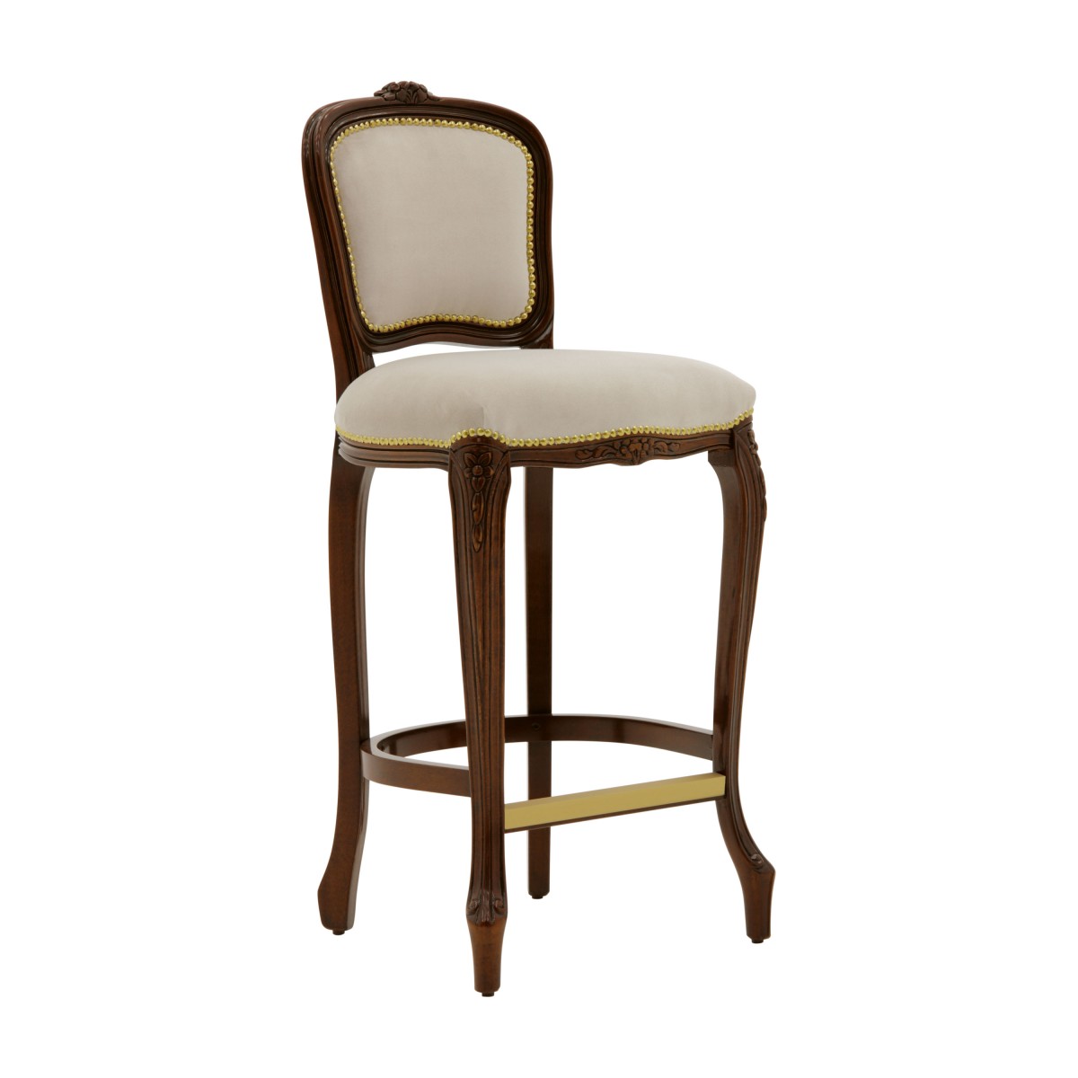 Elegant Louis XV style counter stool with classic lines and beech wood structure. The seat is padded with webbing and superior quality foam. The upholstery can be customized with nails, braiding, double welt or welt.