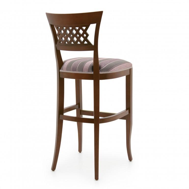 Elegant classic style barstool with beech wood structure featuring a back with diamond shaped openwork. The seat is padded with webbing, springs and superior quality foam. The upholstery can be customized with nails, braiding, double welt or welt.