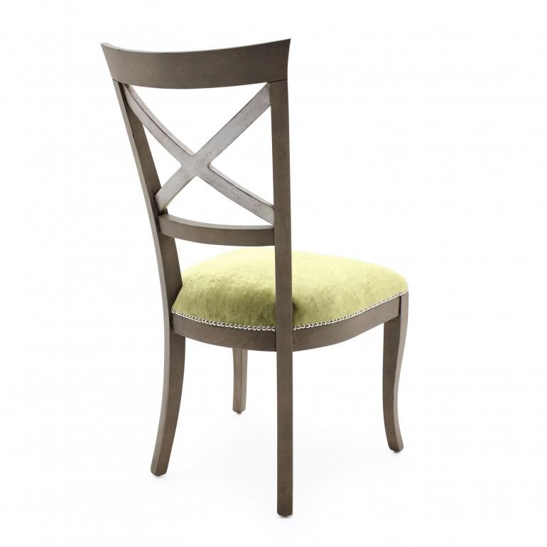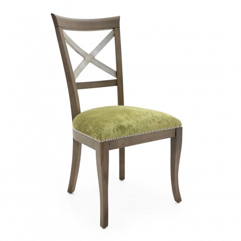 Elegant Classic style chair with beech wood structure and simple essential lines, featuring a cross set into the back. The beauty and elegance of the crossed back rest can be enhanced with a two tone finish or with a gold or silver leaf accent. The seat is padded with webbing, springs and superior quality foam. The upholstery can be customized with nails, braiding, double welt or welt.