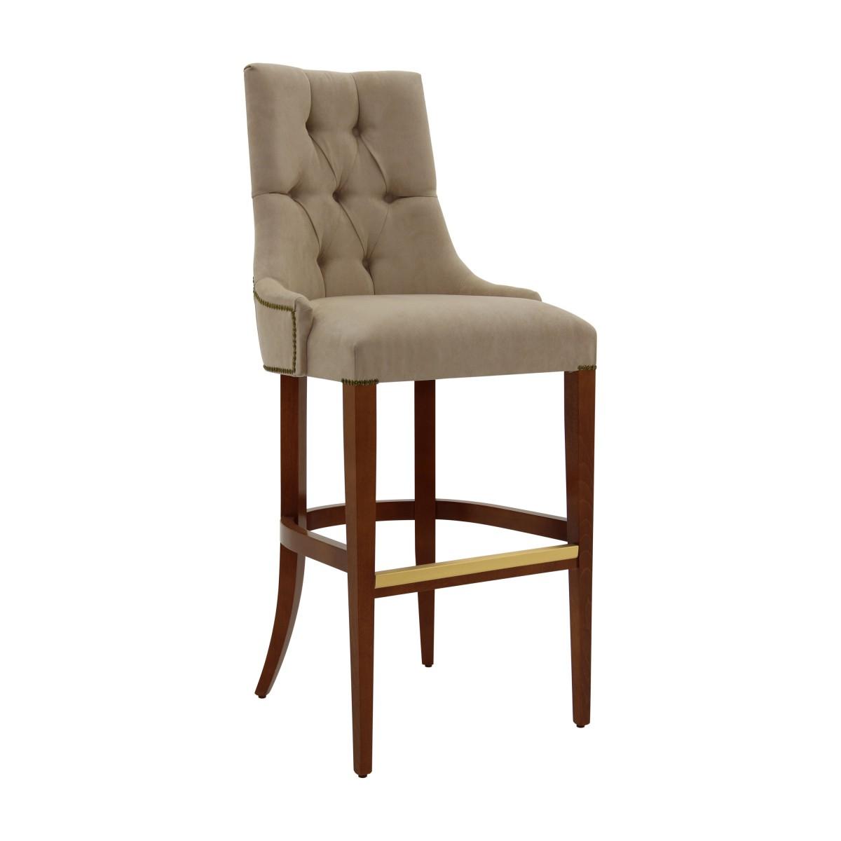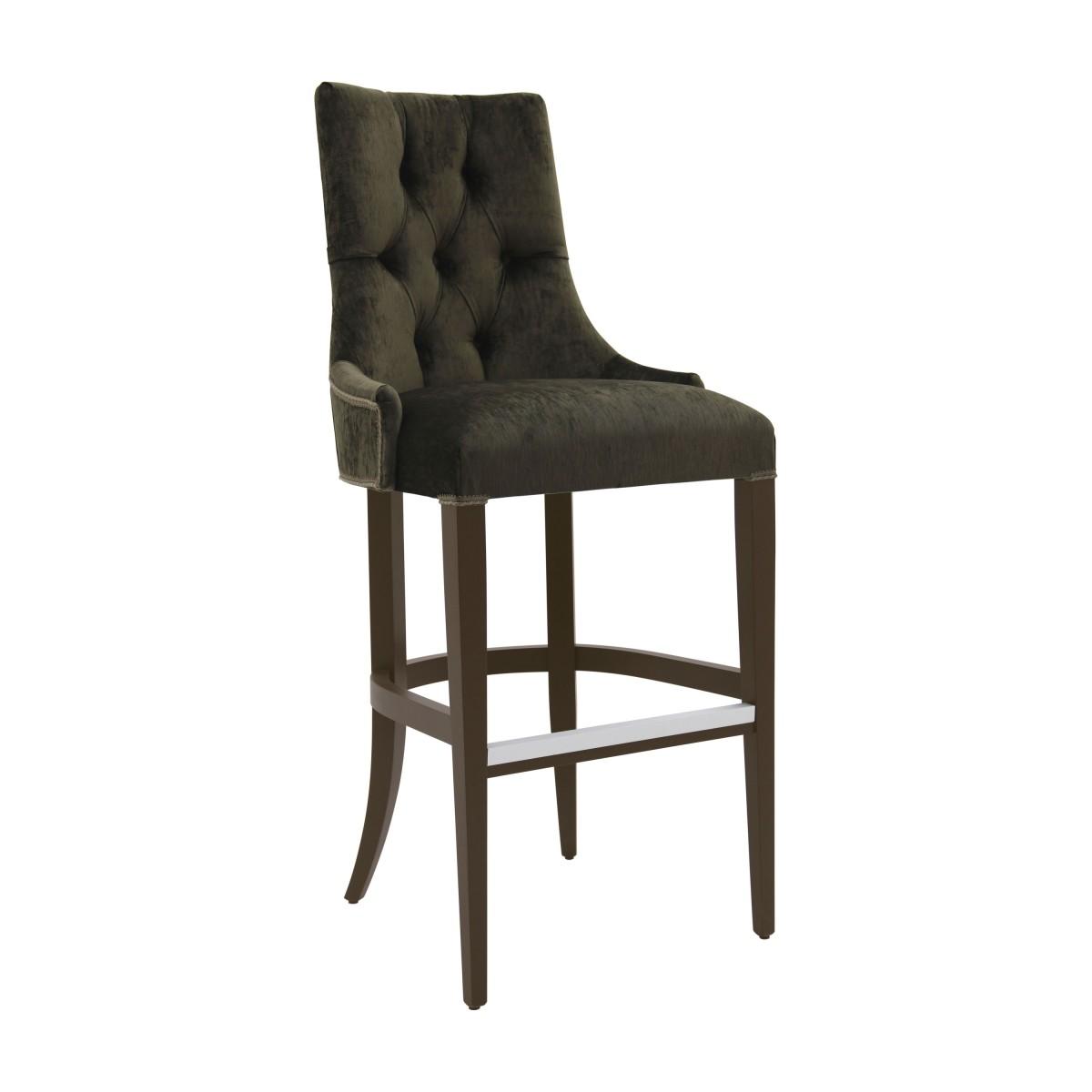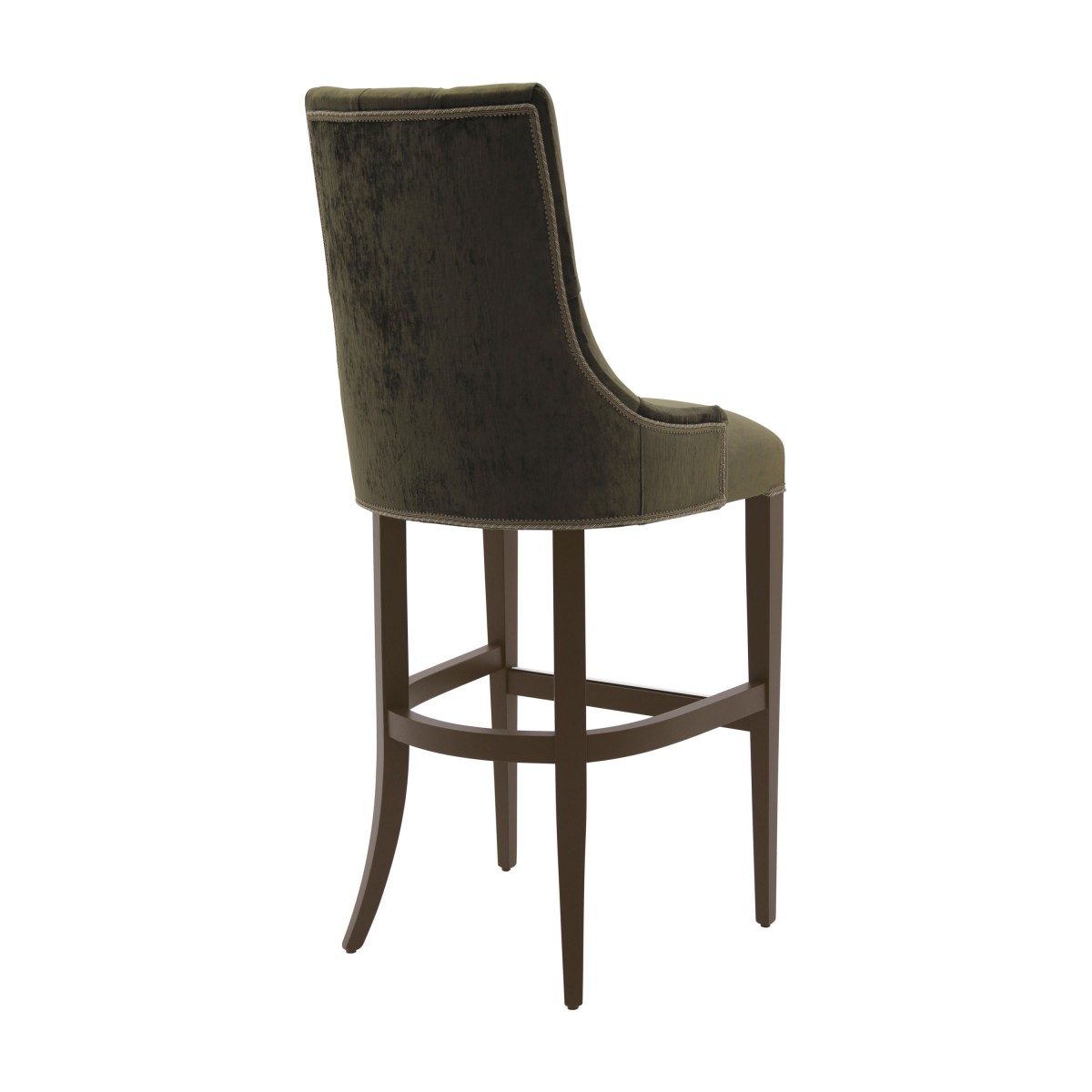 Comfortable Modern style barstool with beech wood structure, simple and captivating lines, featuring a deep-buttoned back. The seat is padded with webbing and superior quality foam. The upholstery can be customized with nails, braiding, double welt or welt.