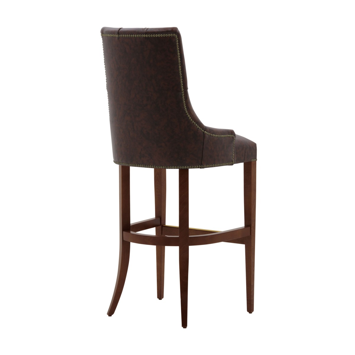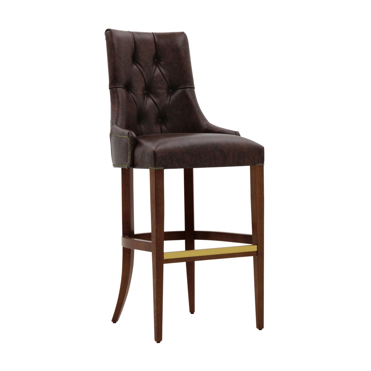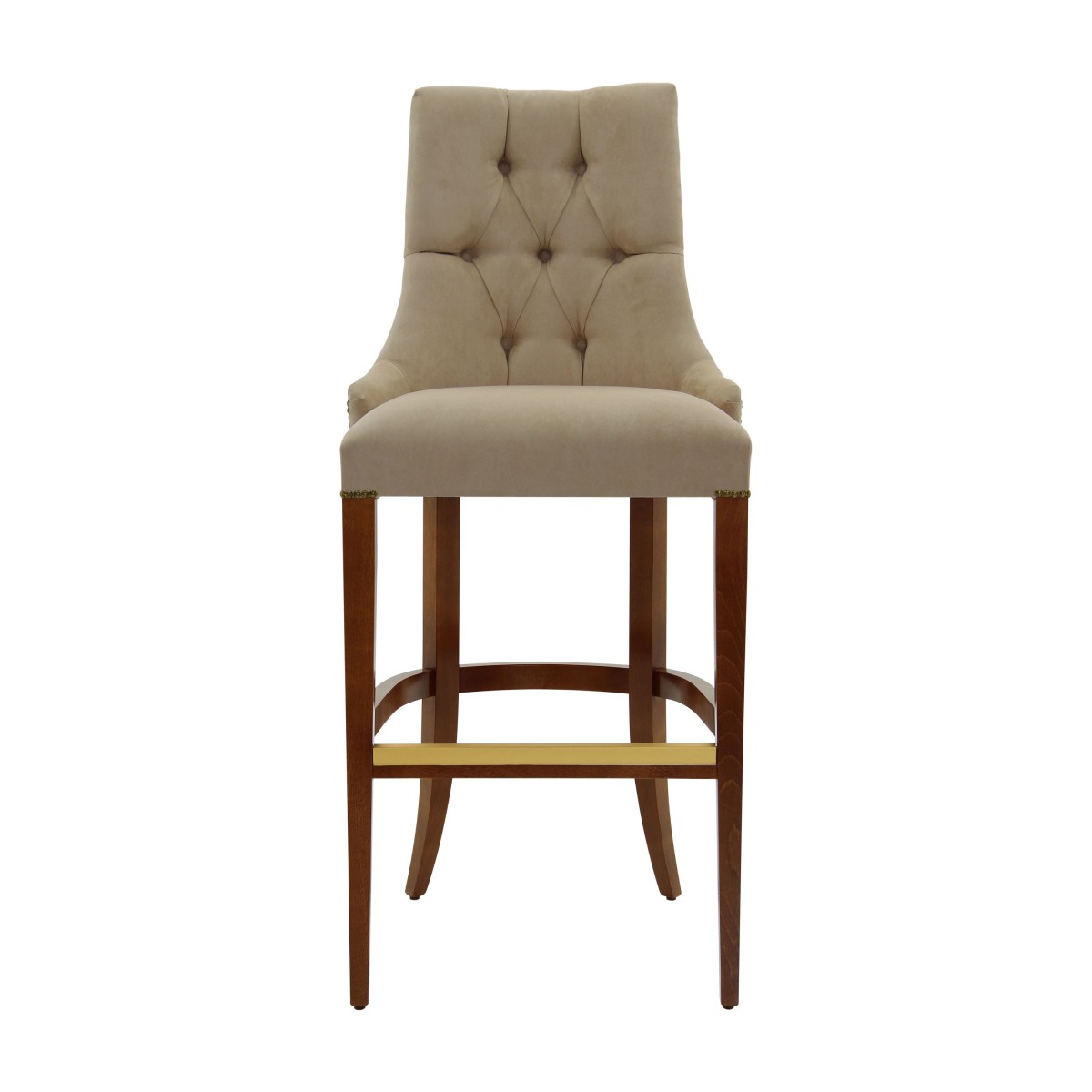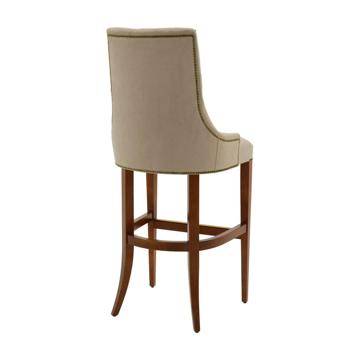Comfortable Modern style barstool with beech wood structure, simple and captivating lines, featuring a deep-buttoned back. The seat is padded with webbing and superior quality foam. The upholstery can be customized with nails, braiding, double welt or welt.