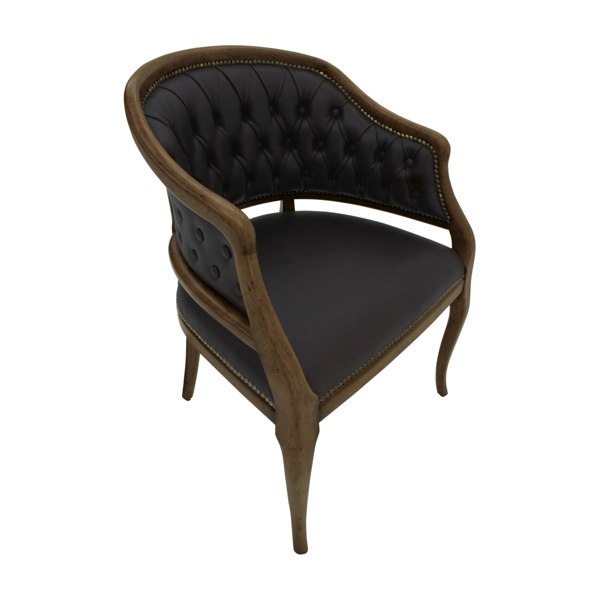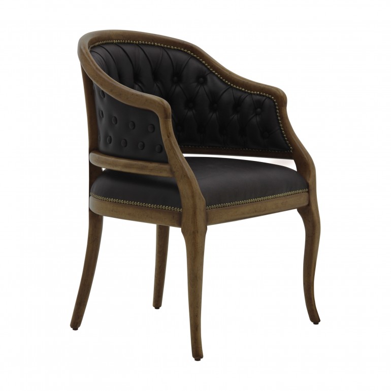Elegant beech wood armchair with particularly sinuous lines. The seat is padded with webbing, springs and superior quality foam. The upholstery can be customized with nails, braiding, double welt or welt.