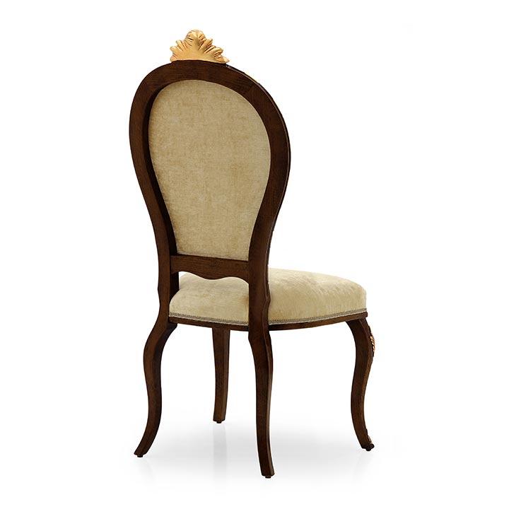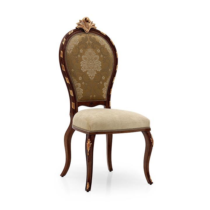 Comfortable Classic style chair with beech wood structure. The carvings on the legs and back can be enhanced with a silver or gold leaf lacquer finish. The seat is padded with webbing, springs and superior quality foam. The upholstery can be customized with nails, braiding, double welt or welt.