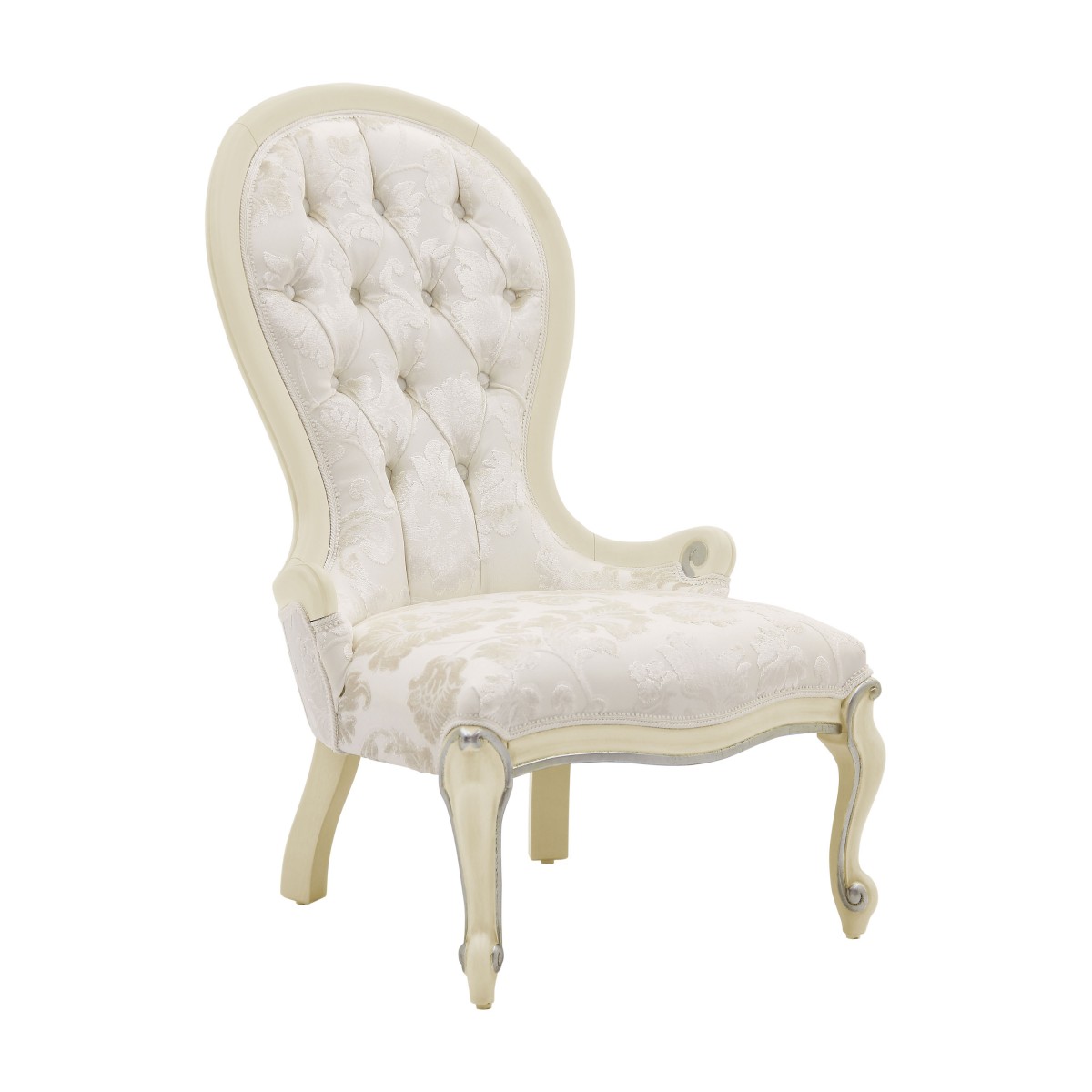 Elegant Louis Philippe style armchair with beech wood structure featuring a distinguishing rounded back. It is upholstered with webbing and superior quality foam. The deep-buttoned back is an optional detail that adds an extra touch of elegance. The upholstery can be customized with nails, braiding, double welt or welt.