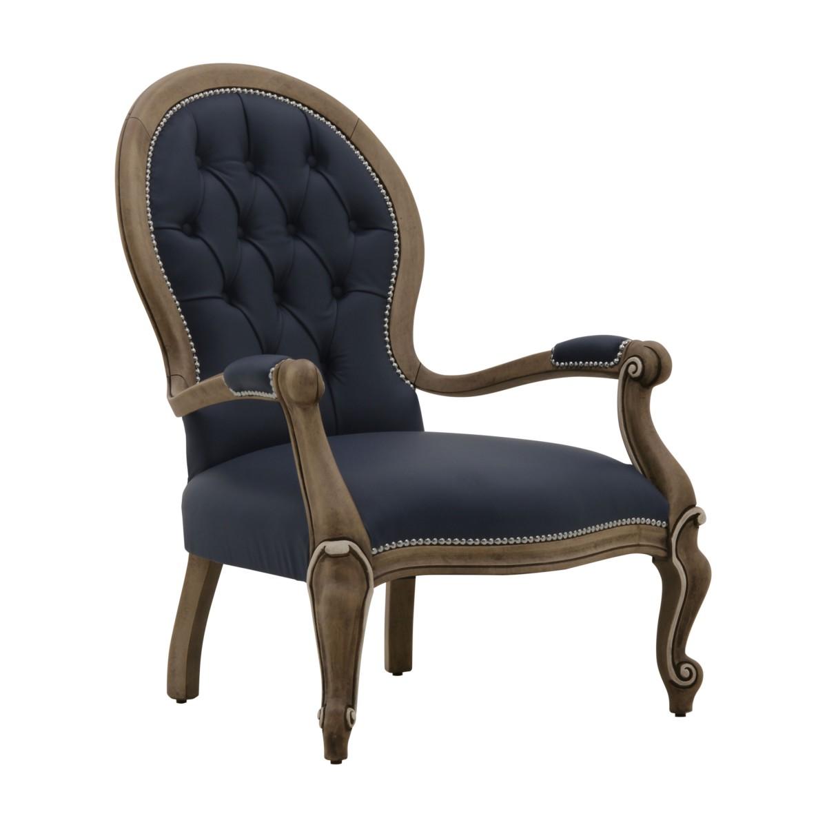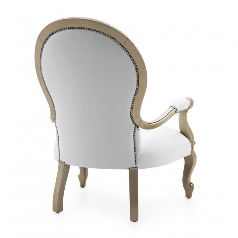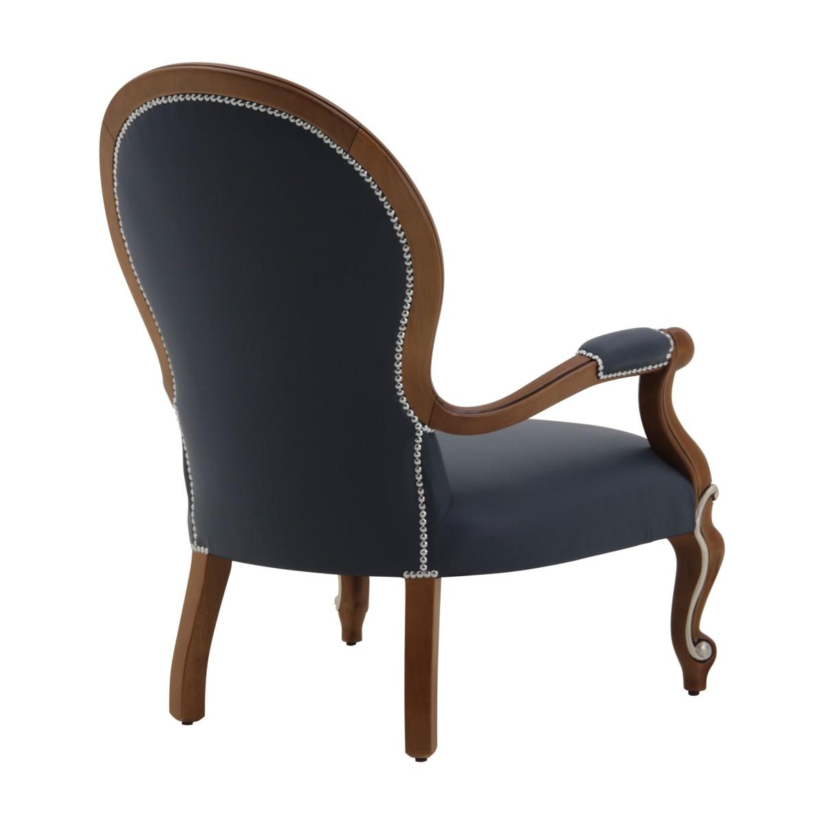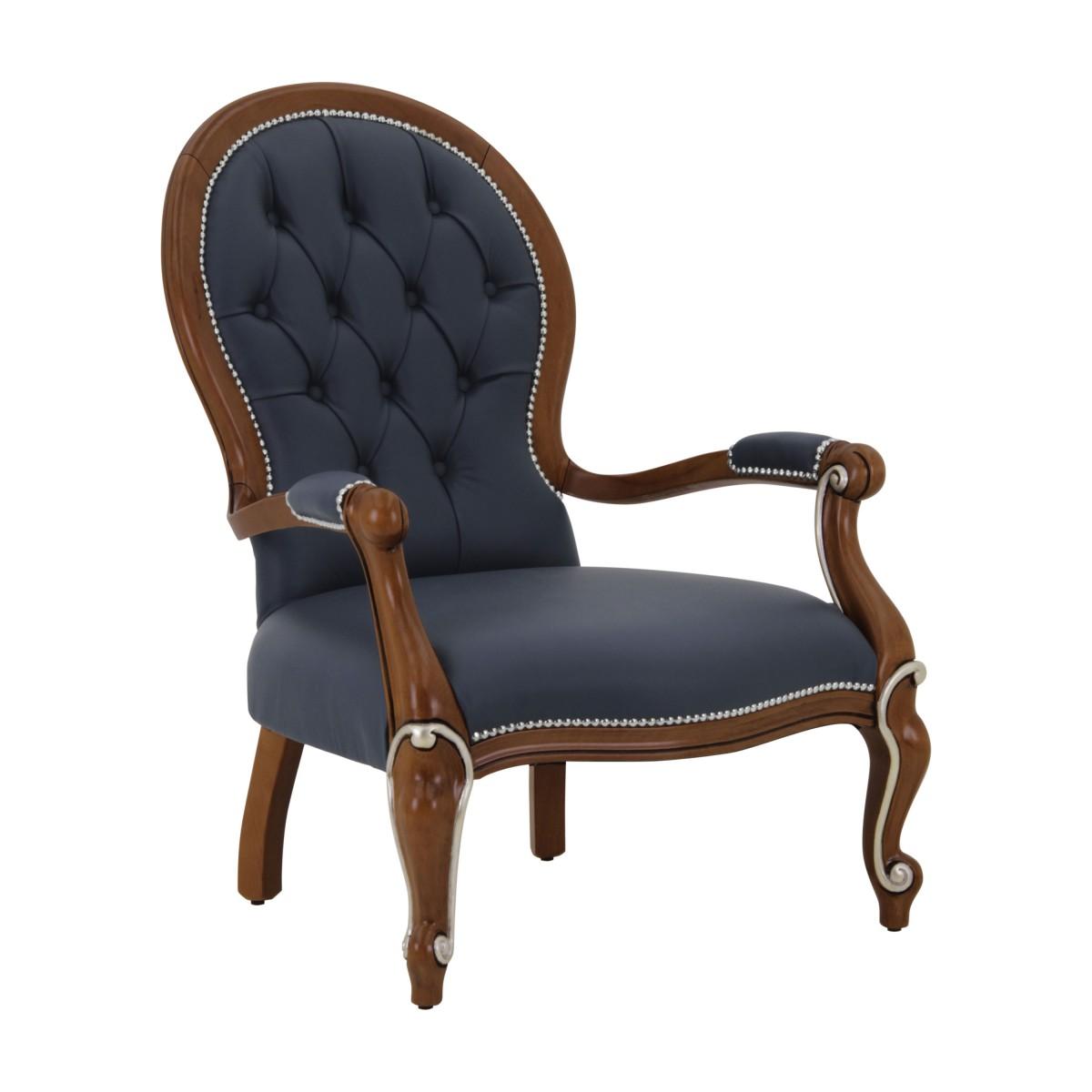 Elegant Louis Philippe style armchair with beech wood structure featuring a distinguishing rounded back. It is upholstered with webbing and superior quality foam. The deep-buttoned back is an optional detail that adds an extra touch of elegance. The upholstery can be customized with nails, braiding, double welt or welt.