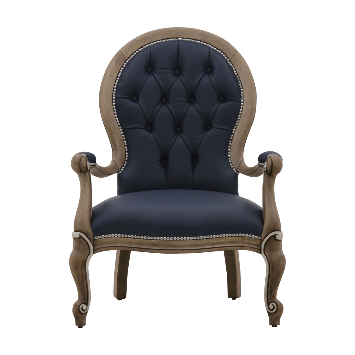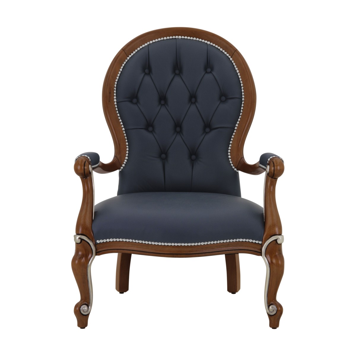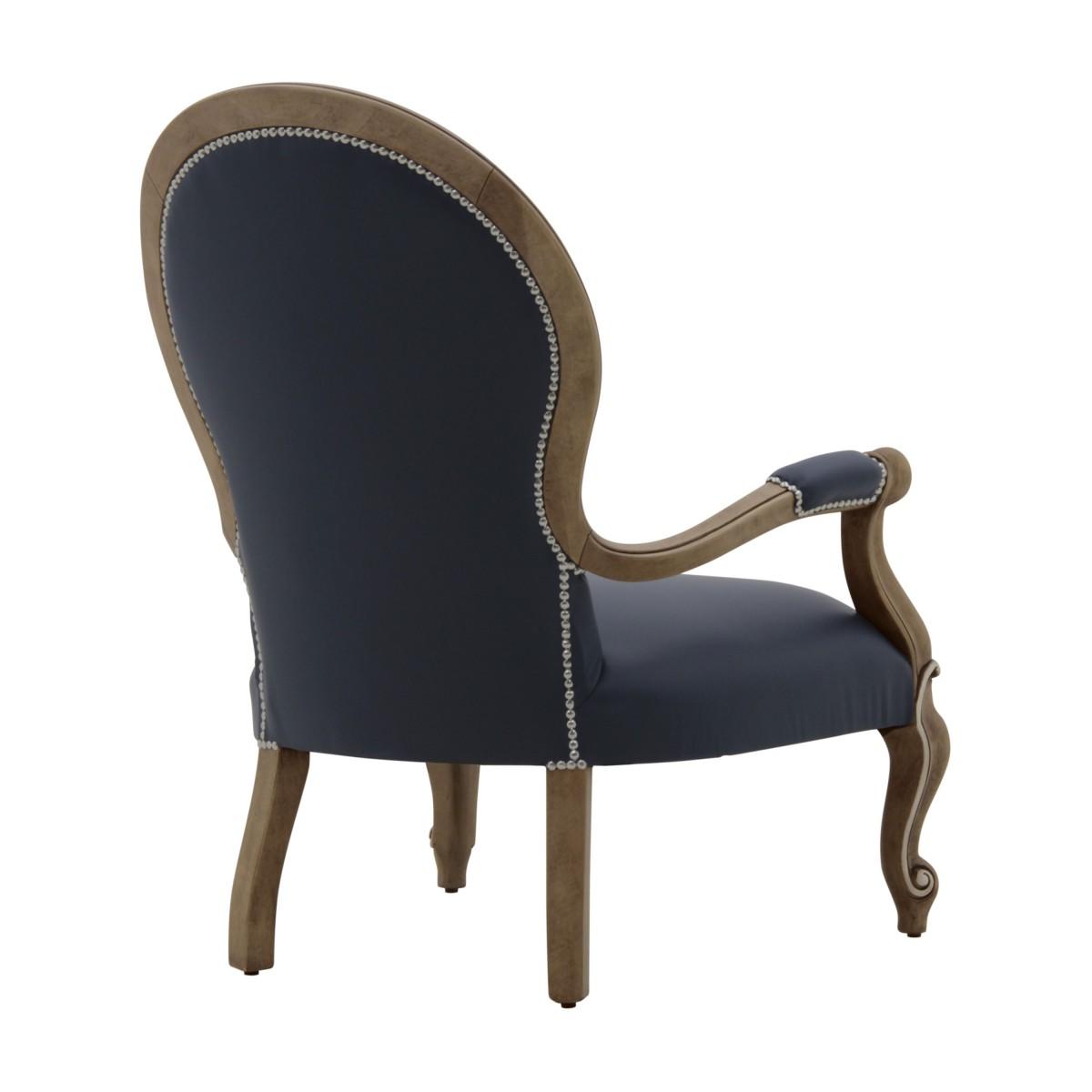 Elegant Louis Philippe style armchair with beech wood structure featuring a distinguishing rounded back. It is upholstered with webbing and superior quality foam. The deep-buttoned back is an optional detail that adds an extra touch of elegance. The upholstery can be customized with nails, braiding, double welt or welt.