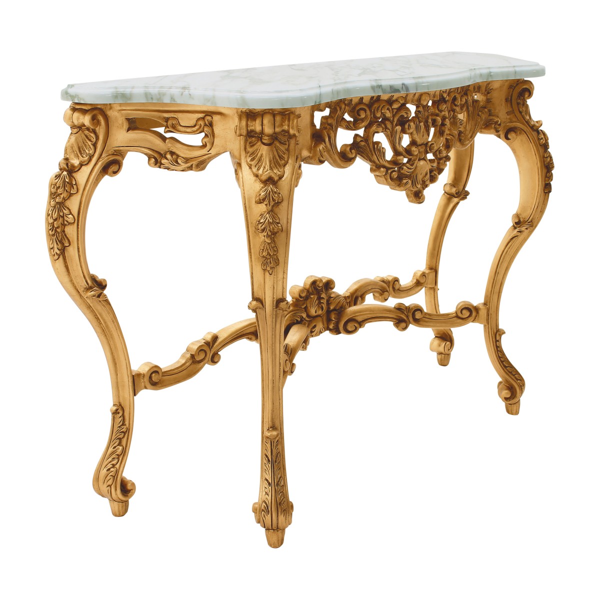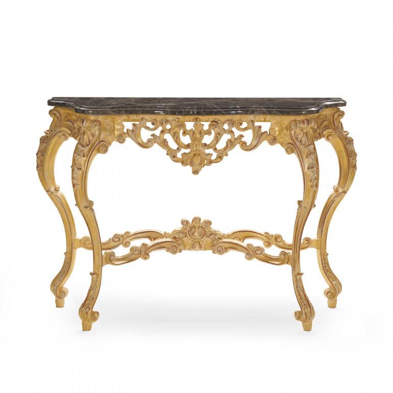 Elegant Baroque style console table designed to stand against a wall, with an elaborate beech wood structure that can be easily combined with a wide range of mirrors from our collections. Given its large size it is particularly suitable as main feature in large living rooms or entrance halls. The marble top adds an extra touch of elegance.