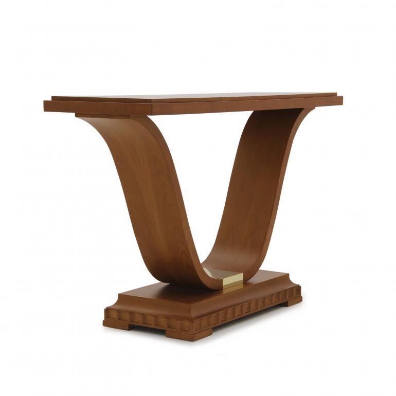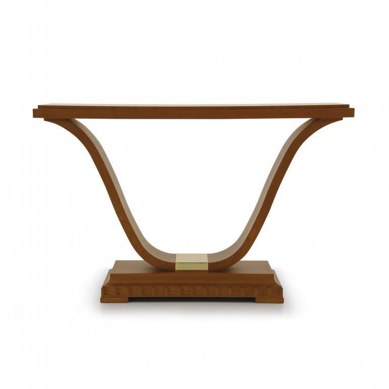 Very elegant and original console table with sinuous and captivating lines. It features a distinctive metal insert that is available in gold or chrome plated finish. This metal element joins the base to the upper part of the console table. The base evokes the elaborate design conceived by Sevensedie’s architects for its Ellipse collection.