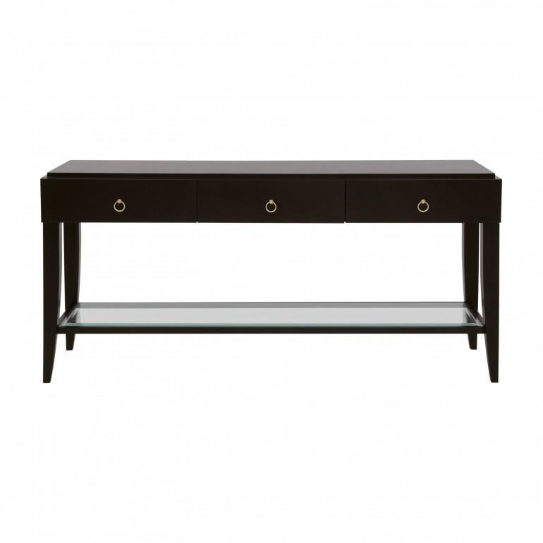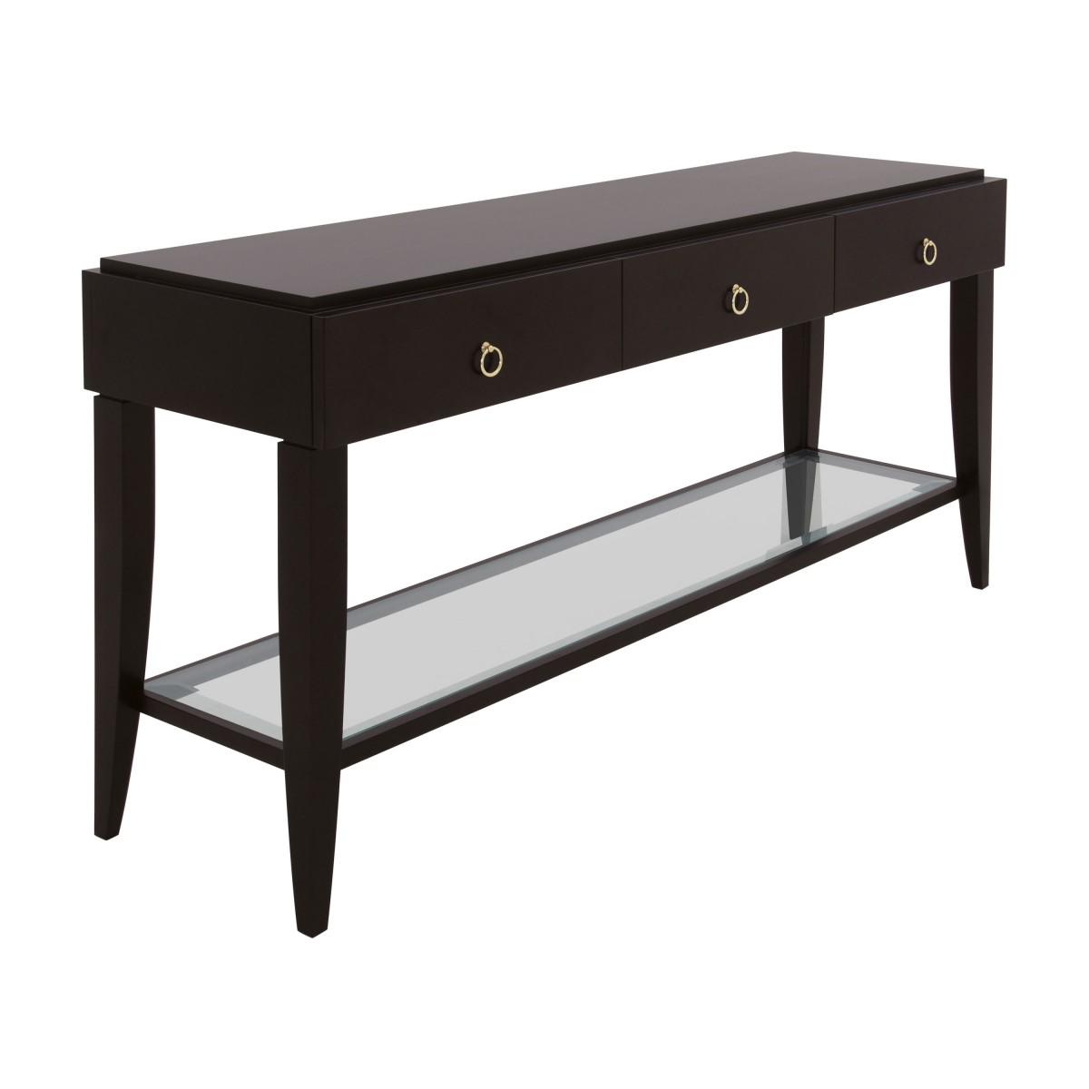 Console table with markedly modern lines and beech wood structure. It features three drawers and a glass shelf that can be used as magazine shelf. The simple shape looks beautiful in both modern and contemporary high-class interiors.