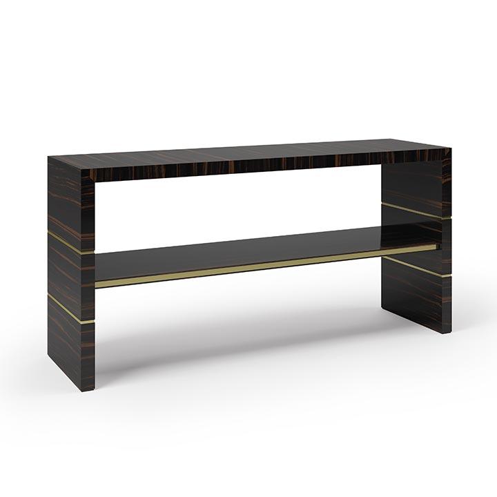 Console table with markedly contemporary lines and Makassar ebony structure. The simple shape looks beautiful in both modern and contemporary high-class interiors. The gold plated edges make this product stand out from all the products present in our collections. This table is produced on request, like all the products noted as “Custom”.