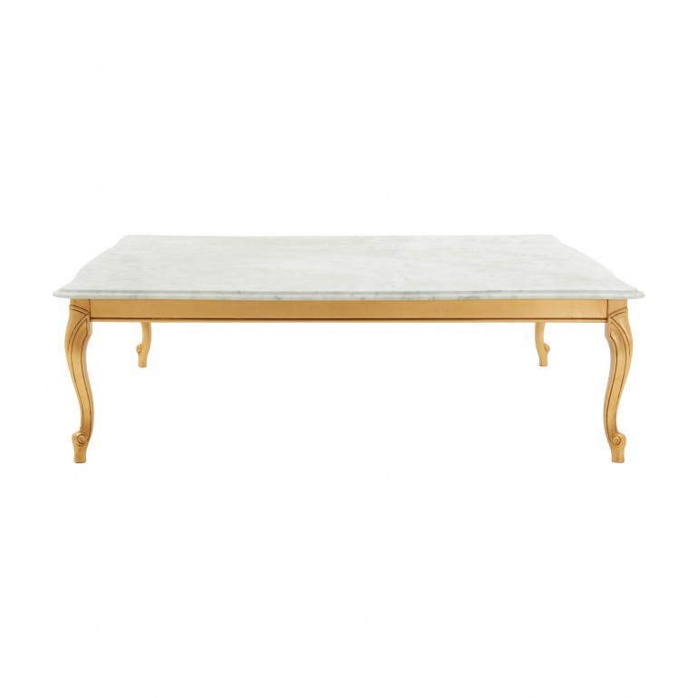 Elegant low square table made of wood with simple lines. It features a large marble top. Considering its size it is particularly suitable as coffee table for large classic style living rooms. The lines of the legs are reminiscent of the Louis Philippe style.