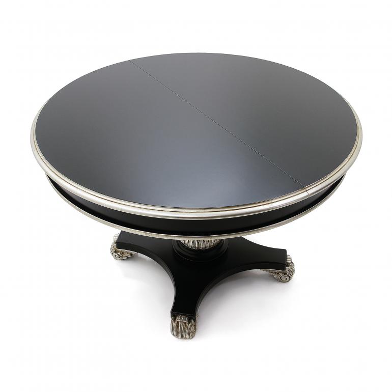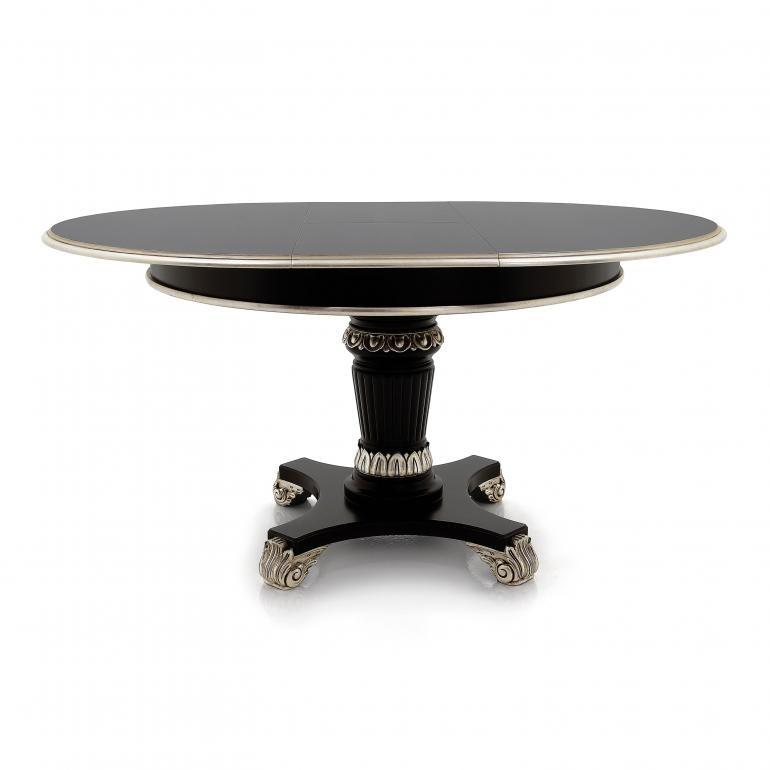 Extremely refined Classic style round table with wooden structure, captivating lines and enriched with carvings. The carved details can be enhanced with a silver or gold leaf lacquer finish. The standard version of this table does not feature the 15.75 in extension for a more versatile use.