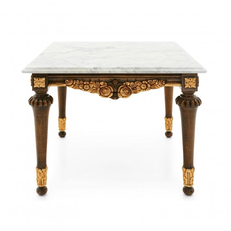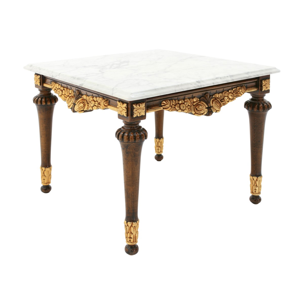 Baroque style square beech wood lamp table with marble top. The table features ornate and refined carvings on the side bands and legs that can be enhanced with a silver or gold leaf lacquer finish.
