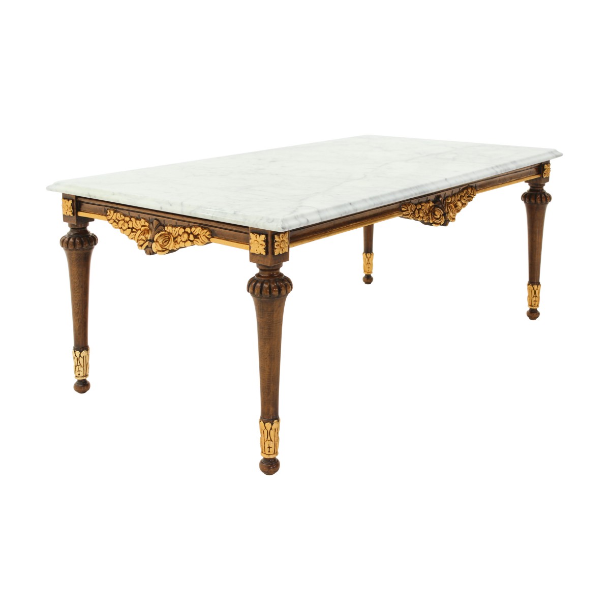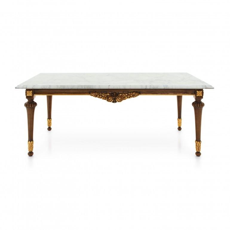 Baroque style square beech wood coffee table with marble top. The table features ornate and refined carvings on the side bands and legs that can be enhanced with a silver or gold leaf lacquer finish.