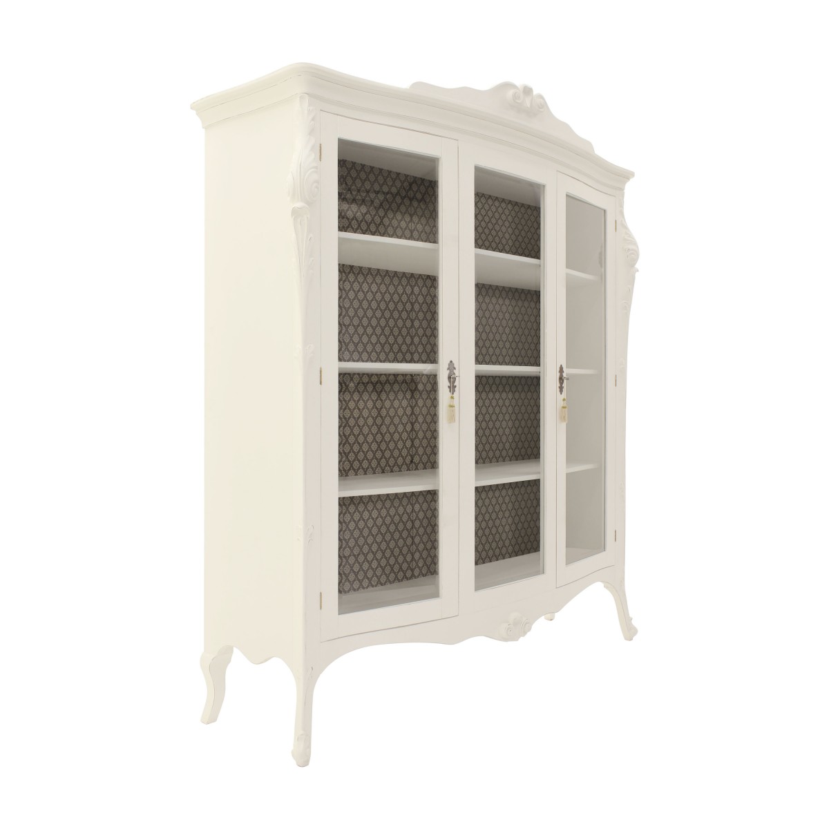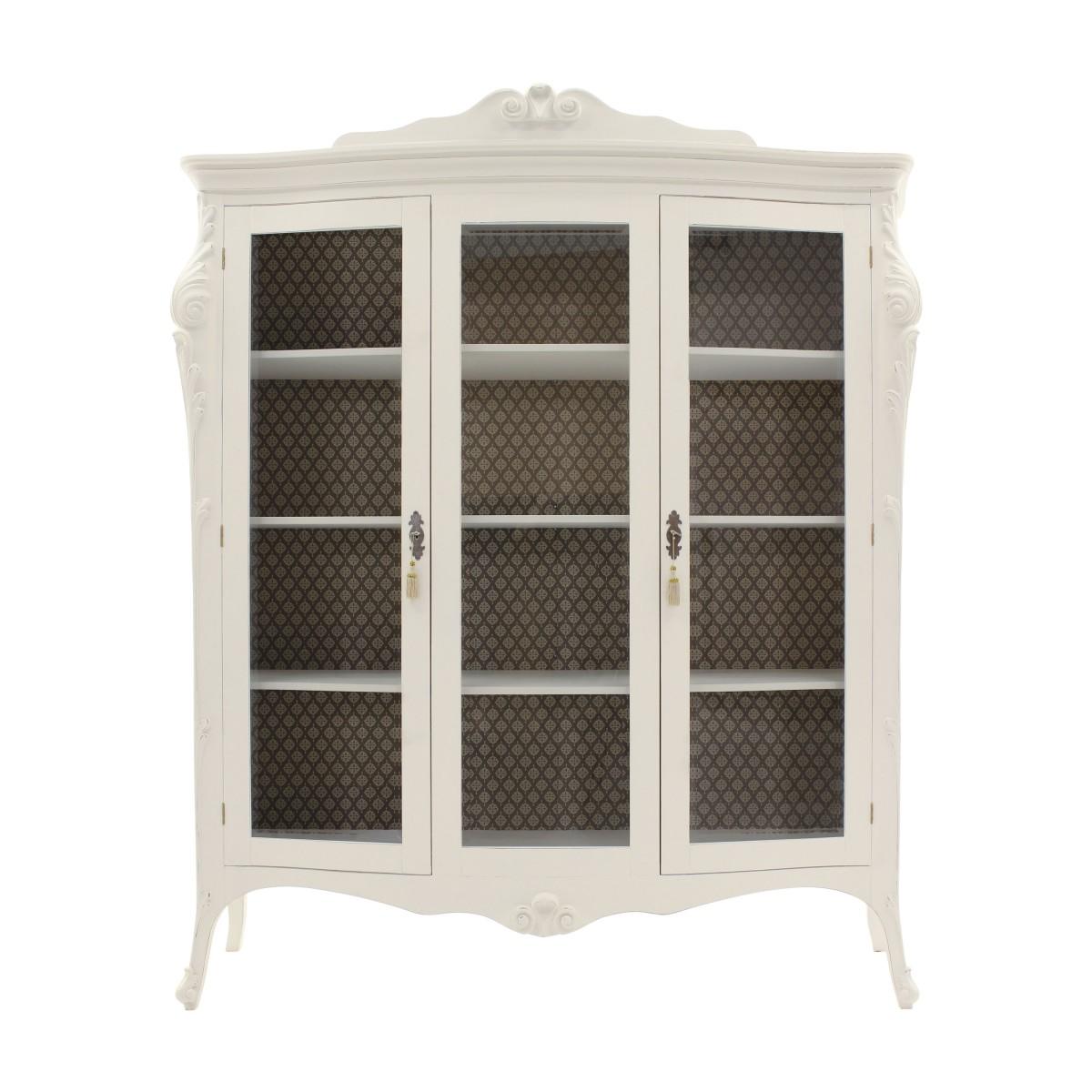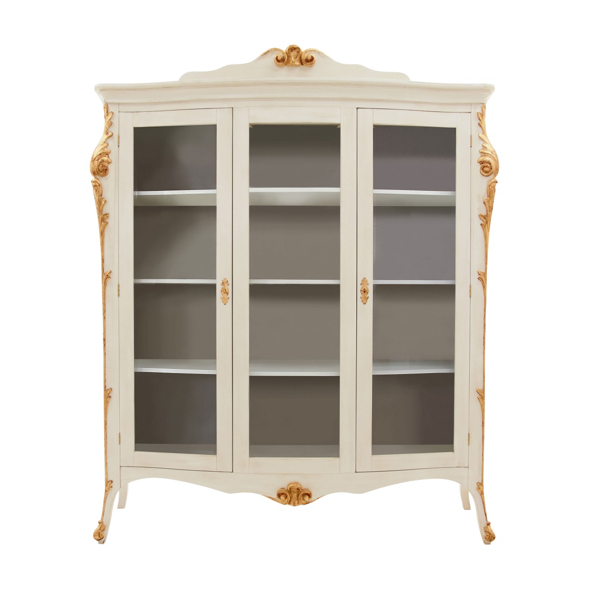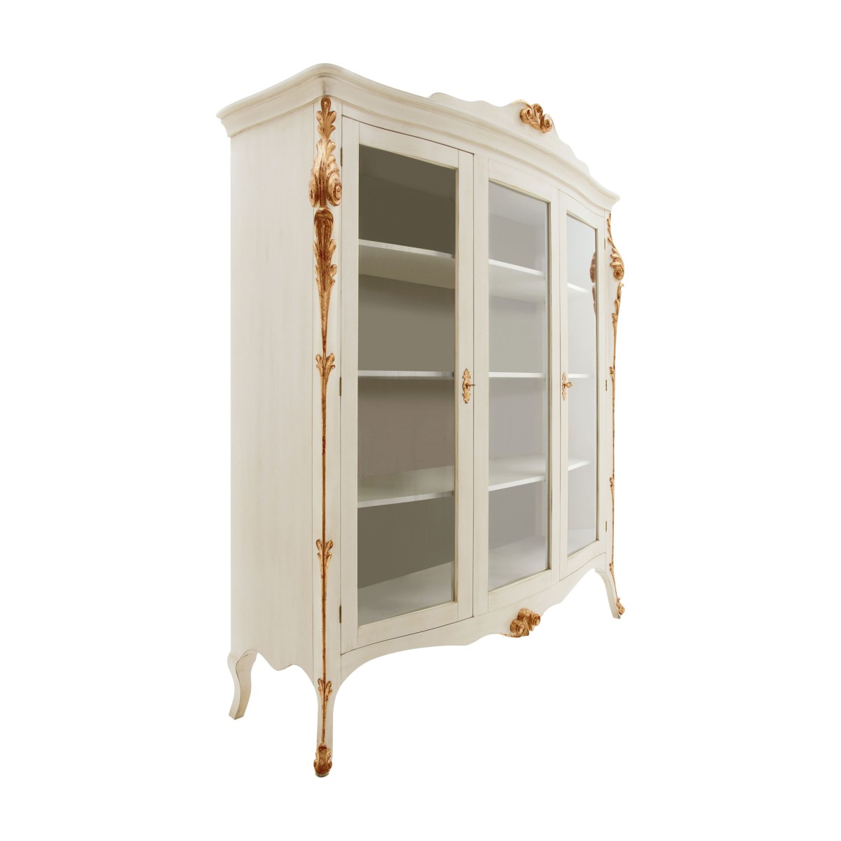 Elegant Venetian style two door display cabinet. It features wooden shelves and is characterized by manual LED lights that illuminate the inside and enhance the fabric covered back panel. As for all our products the fabric is customizable and can even be supplied by the customer. It features many details that can be enhanced with a silver or gold leaf lacquer finish.