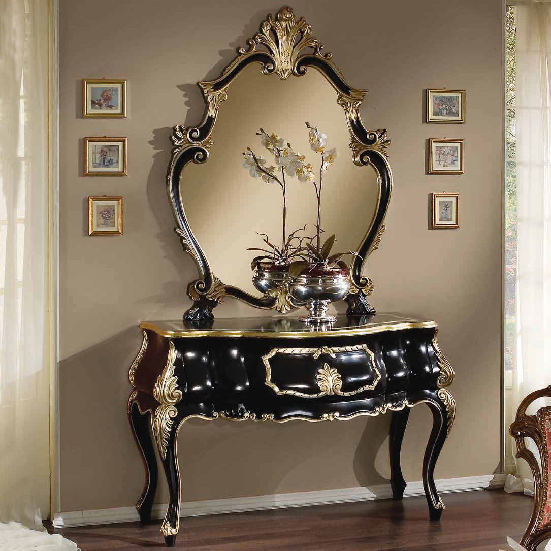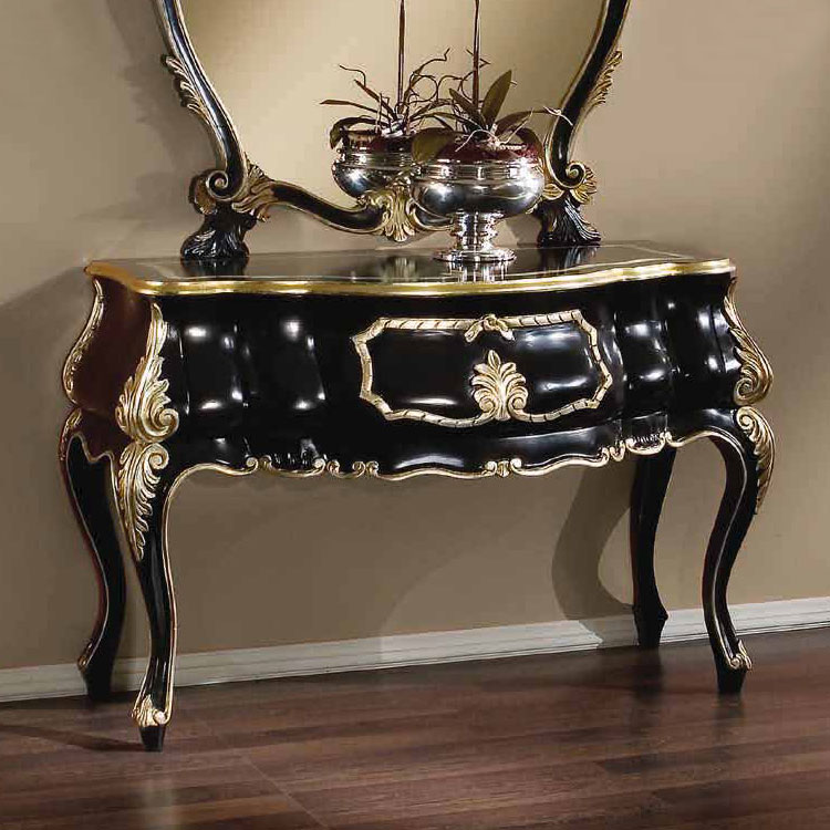 Hand carved Bombay Console, decorated in black finish and gold leaf trim. Shown with 2064-B carved mirror.