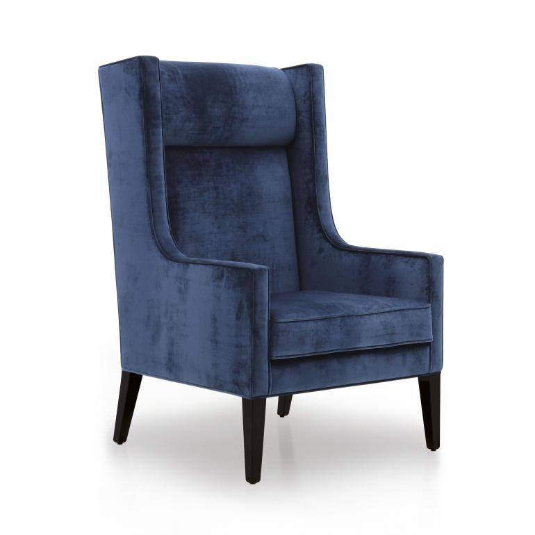 Comfortable armchair with markedly contemporary and austere lines, featuring an original headrest. The armchair is upholstered with webbing and superior quality foam and has a comfortable padded seat cushion. Contrasting colored piping is particularly suitable for this item.