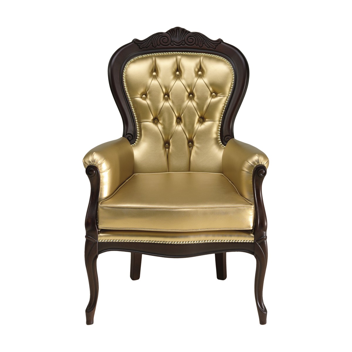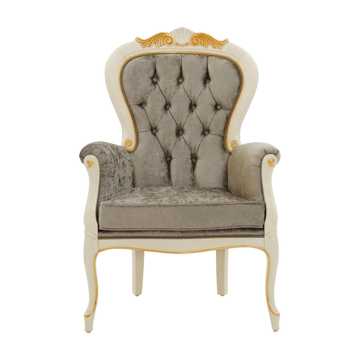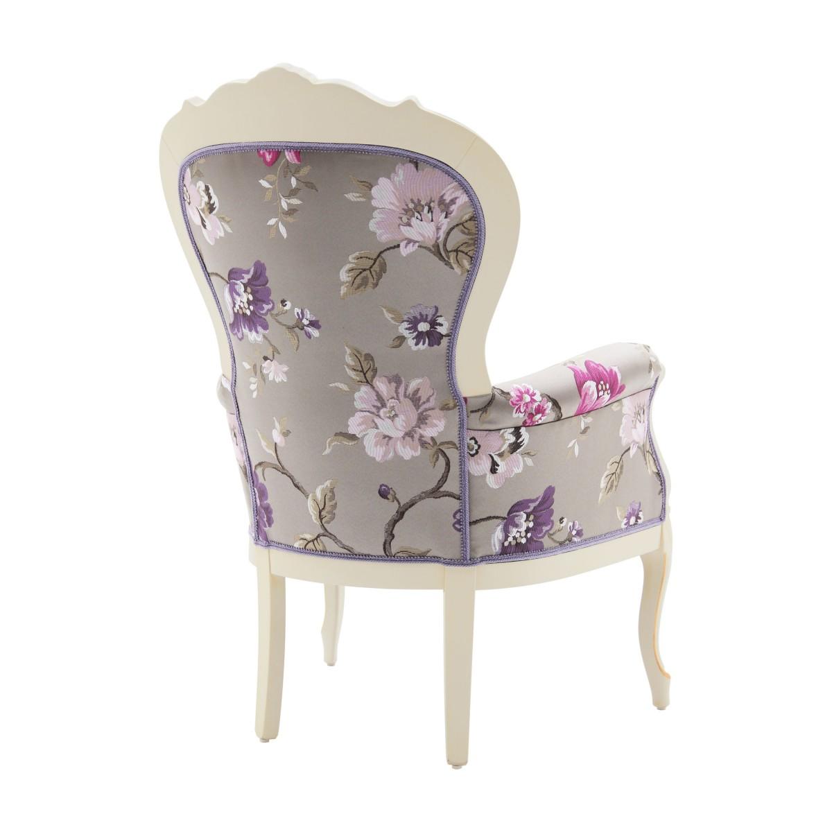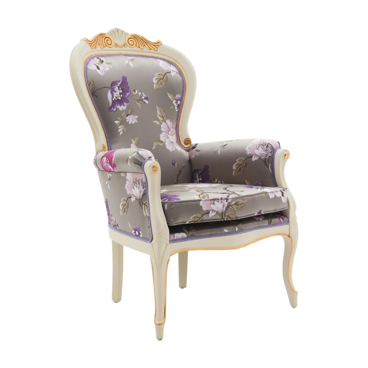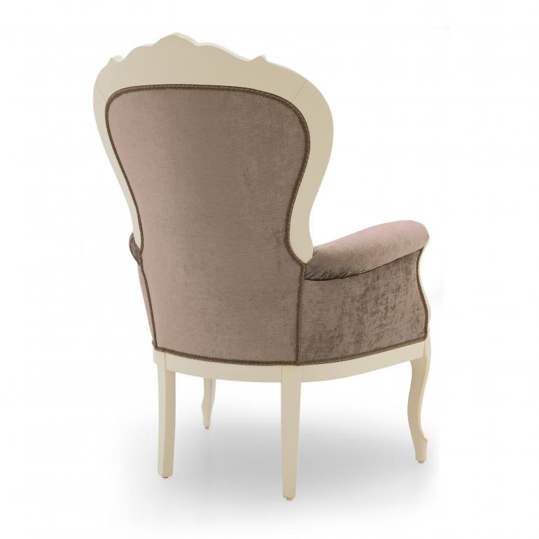 Classic armchair in Louis Philippe style with beech wood structure enriched with details that can be enhanced with a gold or silver leaf lacquer finish. The armchair is upholstered with webbing and superior quality foam and has a comfortable padded seat. The upholstery can be customized with nails, braiding, double welt or welt.