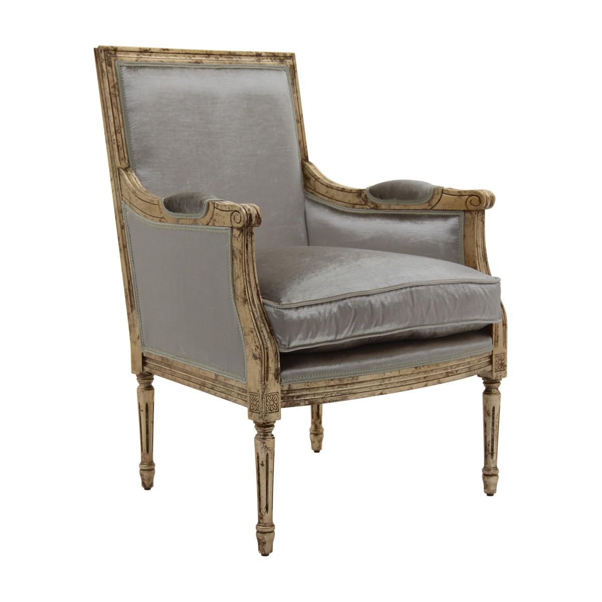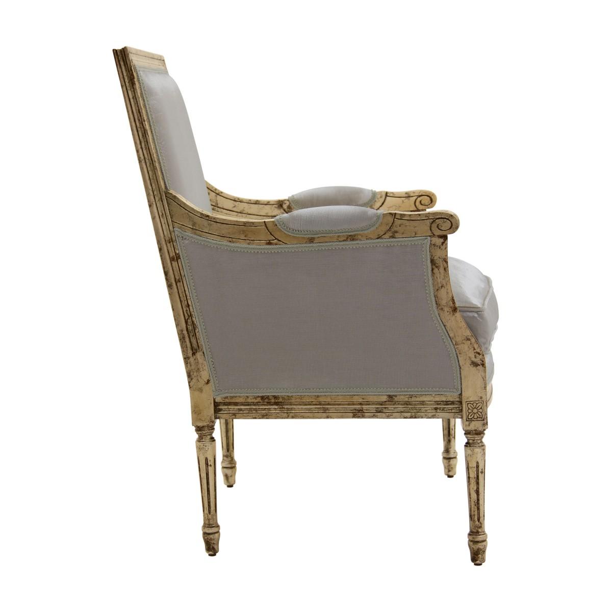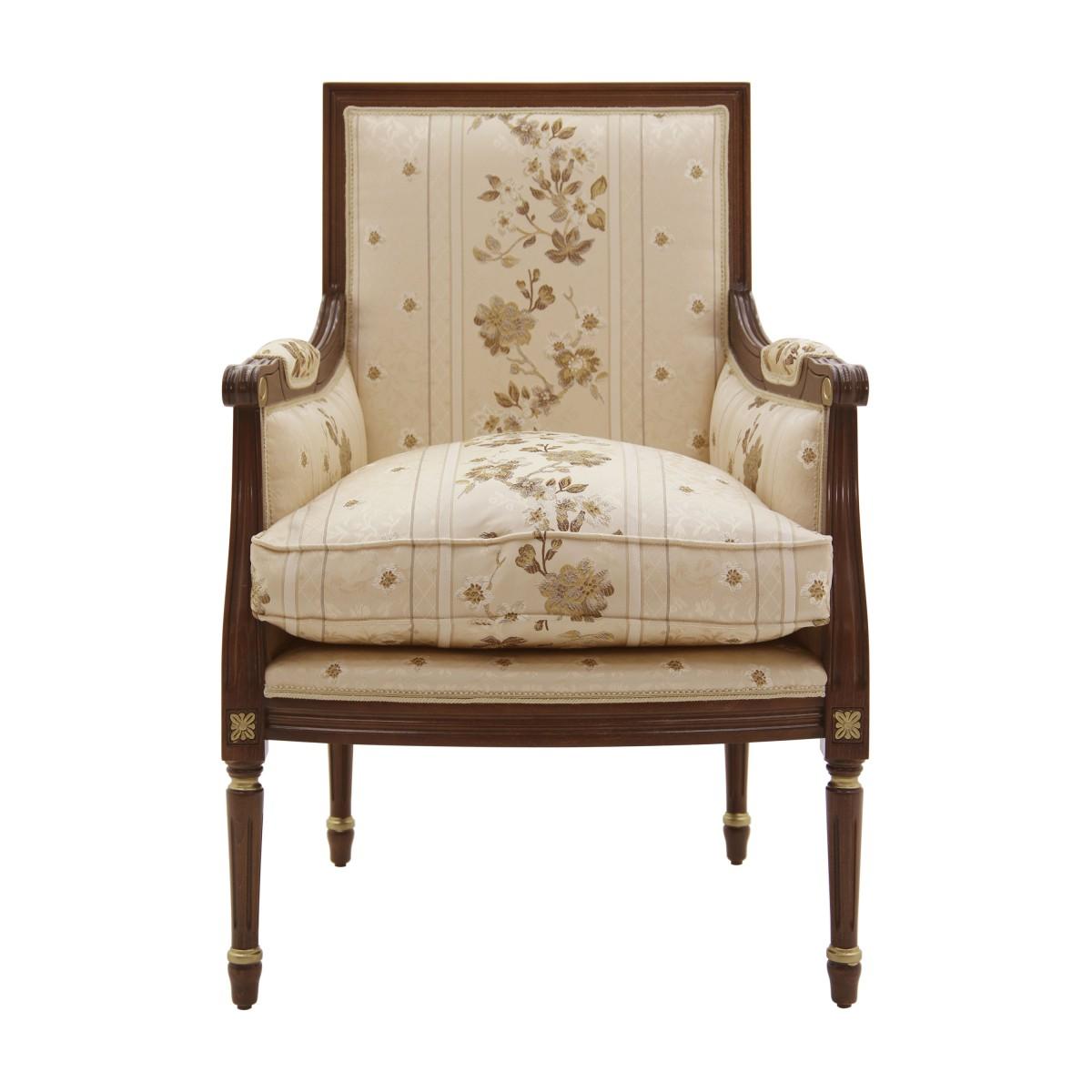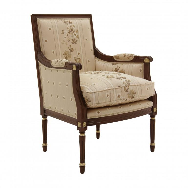 Elegant Louis XVI style armchair with beech wood structure. The armchair is upholstered with webbing and superior quality foam and has a comfortable padded seat cushion. The upholstery can be customize with nails, braiding, double welt or welt.