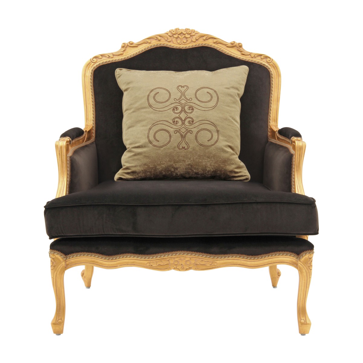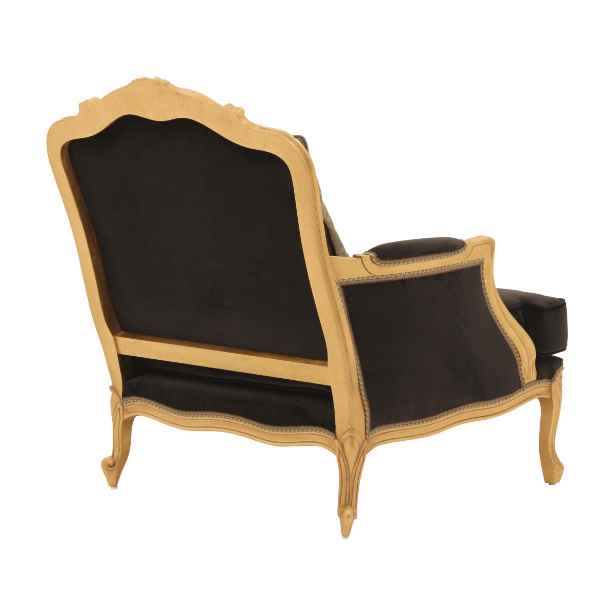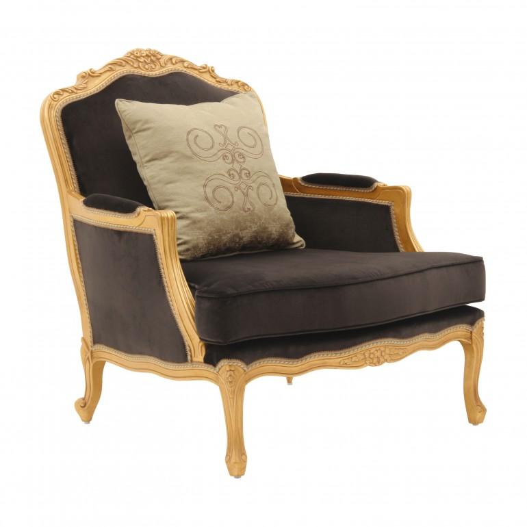 Comfortable classic style armchair with wide beech wood structure. It features many carved details that can be enhanced with a silver or gold leaf lacquer finish. The armchair is upholstered with webbing and superior quality foam and has a comfortable padded seat cushion. The upholstery can be customized with nails, braiding, double welt or welt.
