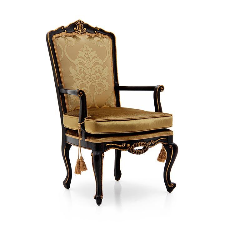 Elegant classic style armchair with beech wood structure. It features many details that can be enhanced with a gold or silver leaf lacquer finish. The seat is padded with webbing and superior quality foam and features a removable cushion fastened to the back with elegant ties. The upholstery can be customized with nails, braiding, double welt or welt.