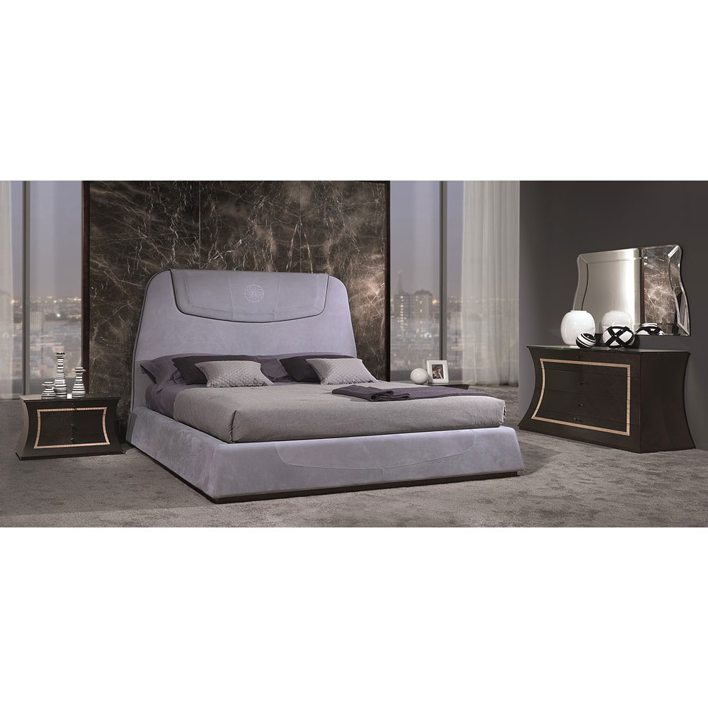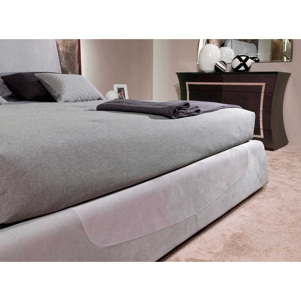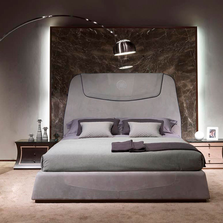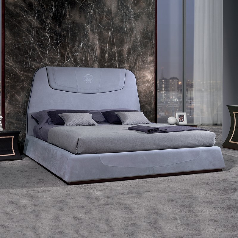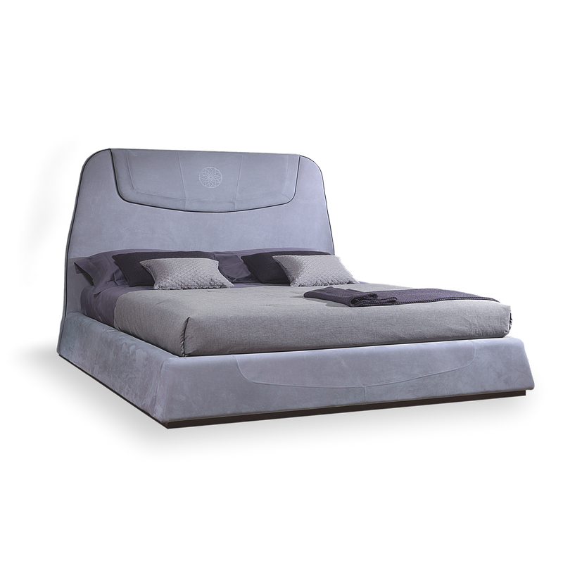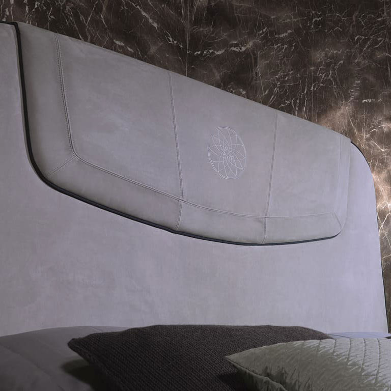 Fully padded bed can be covered in leather, nubuck or fabric. The bed is characterized by an embroidery in the center of the headboard and by a creasing along its entire profile. The English stitching helps to draw the line of the bed. Structure in plywood, padded with non-deformable polyurethane foam. Possibility of container base with two-movement liftable base or with fixed standard flat base in support. Base in dark Sycamore stained wood. Bench also available.
