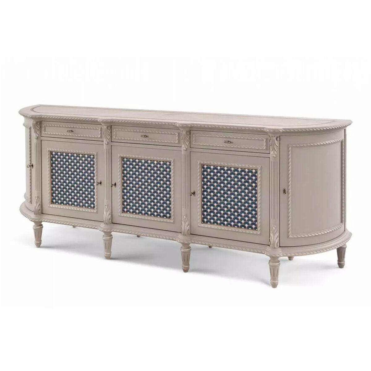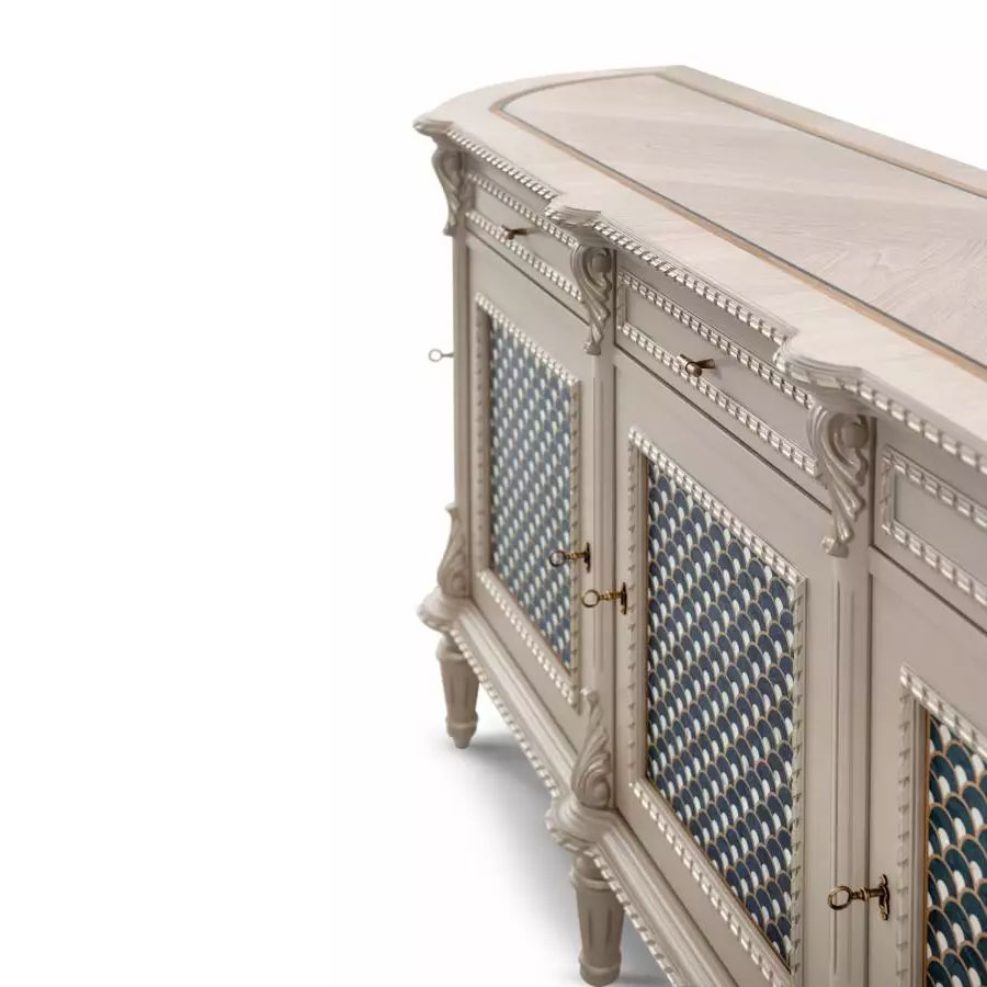 5 doors sideboard, structure and parts in solid wood with matt grey lacquered finish, 3 drawers and 2 lateral doors with matt grey lacquered finish, 3 central doors finely inlaid with mother-of-pearl, erable tinged blue with profile in canaletto walnut, wooden top veneered in canaletto walnut tinged grey and decorative profiles with erable tinged blue and walnut, with decorated carvings.