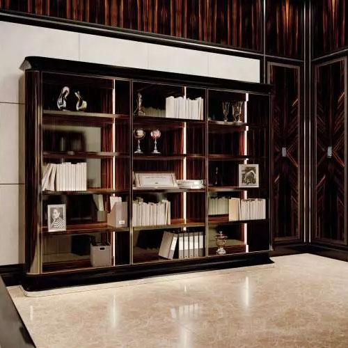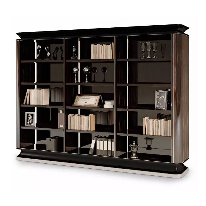 Bookcase in ebony with black lacquered parts and chromed brass details.