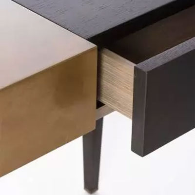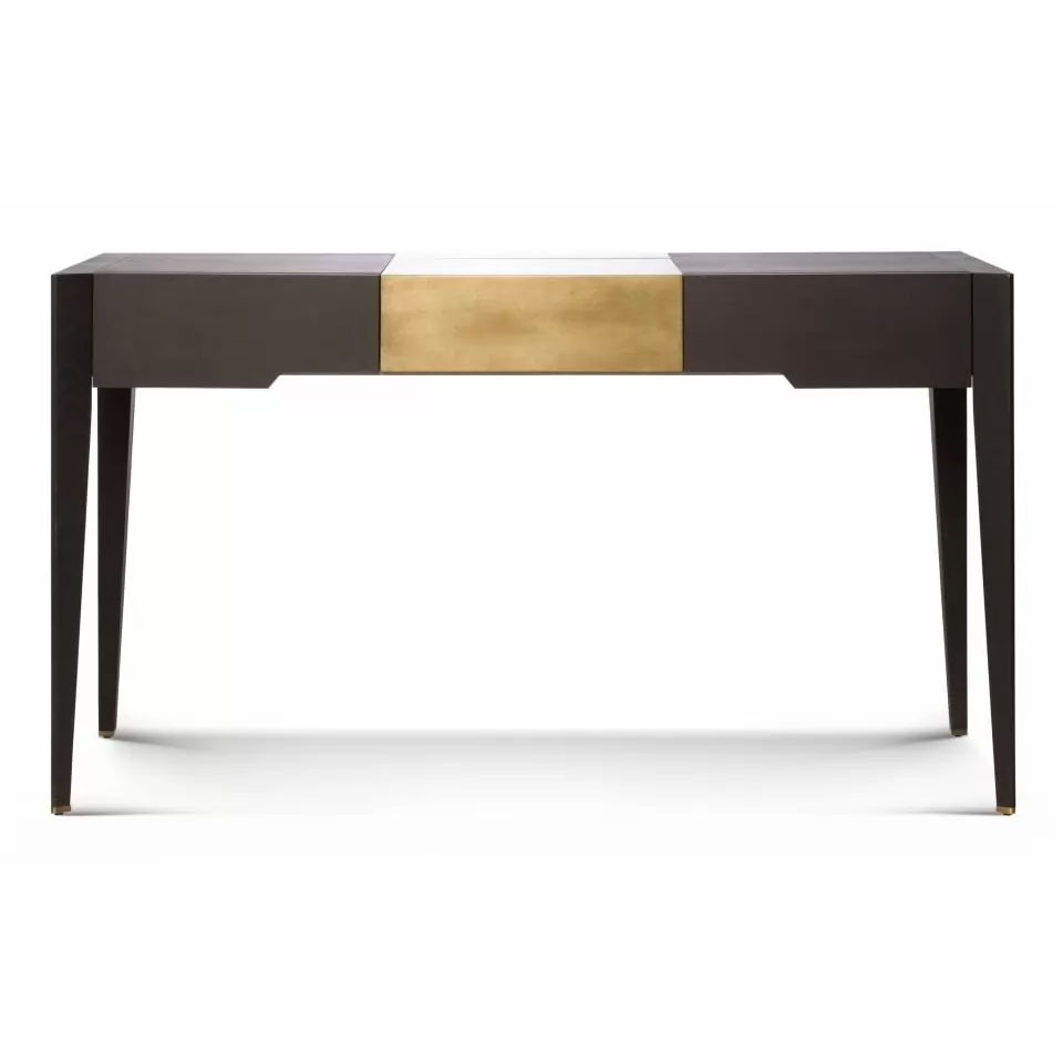 Vanity in plywood veneered and parts in Ash wood, urban black finished. It has a central flap compartment bronze lacquered, inside housing in grey dyed Maple and End-feet in light bronzed matt brass.