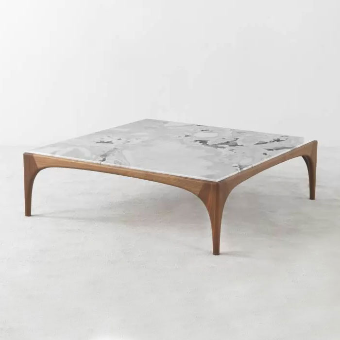 Square coffee table base in solid Canaletto walnut, matt finish. Marble top Dover white.