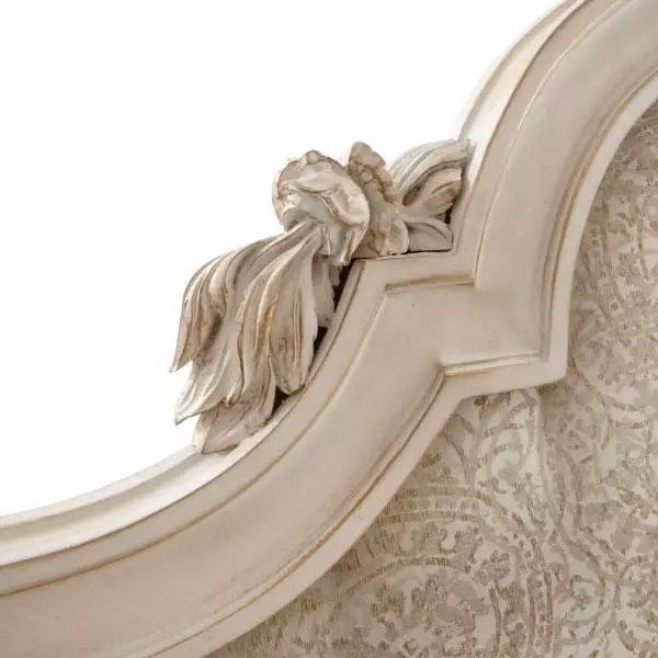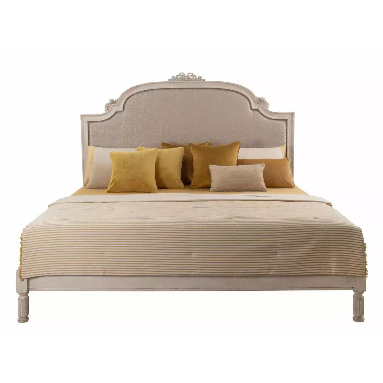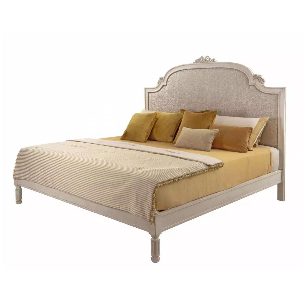 Bed with headboard in carved wood, panel upholstered with fabric with wooden bedhome, finish LAFM lacquered brushed french tempera white meringue with base gold leaf.