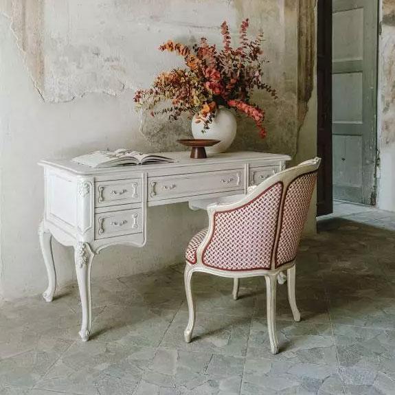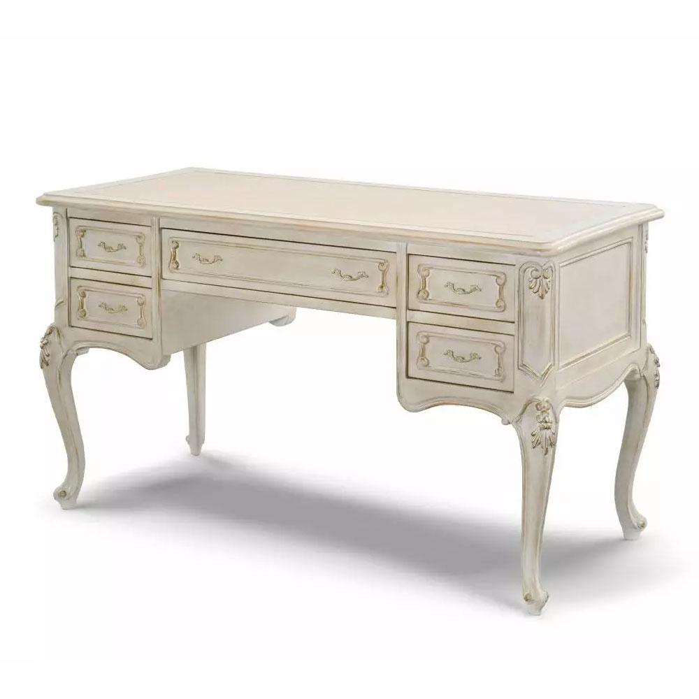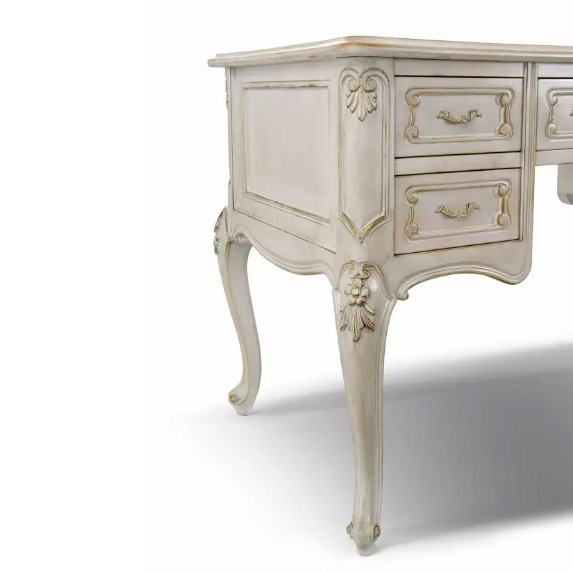 A refined desk with leather insert and made with LAFM lacquered brushed french tempera white meringue with base gold leaf.