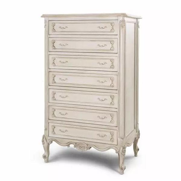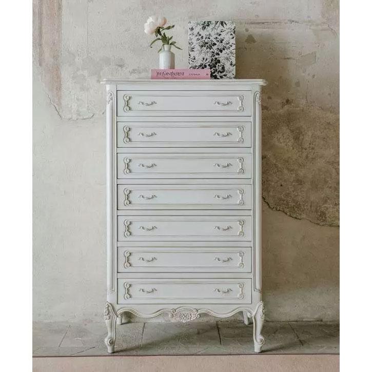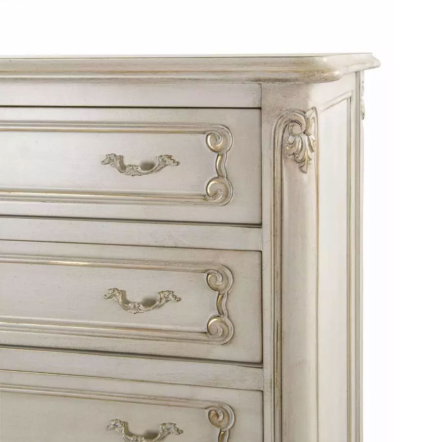 Chest of 7 drawers with linear and essential shapes with finish LAFM lacquered brushed french tempera white meringue with base gold leaf.