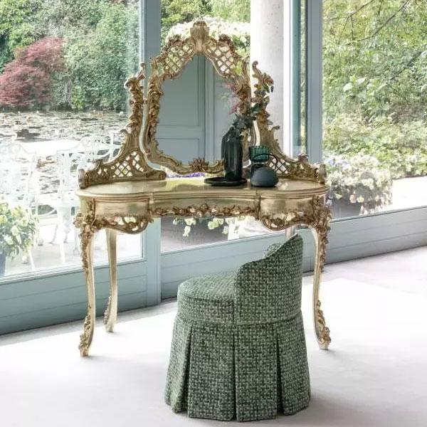 The dressing table with incorporated mirror, a unique piece that adds character to the setting thanks to rich inlay work.
