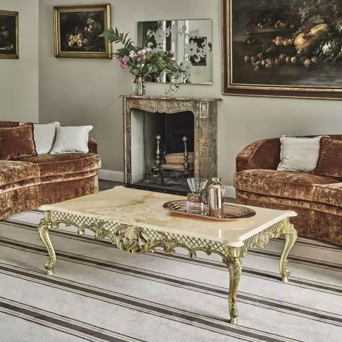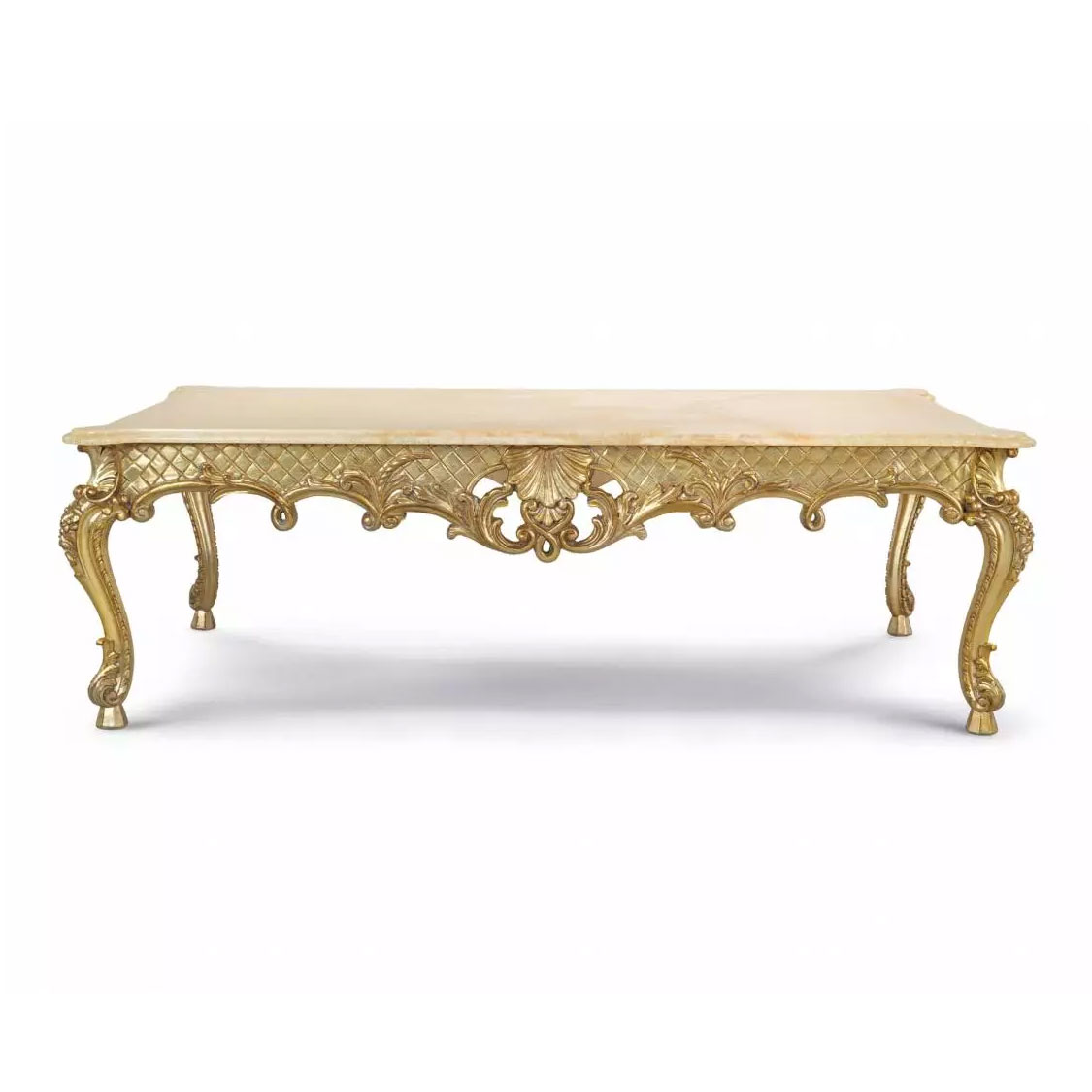 Coffee table with marble top Honey Onyx, carved base with leaf finish Silver Gold.