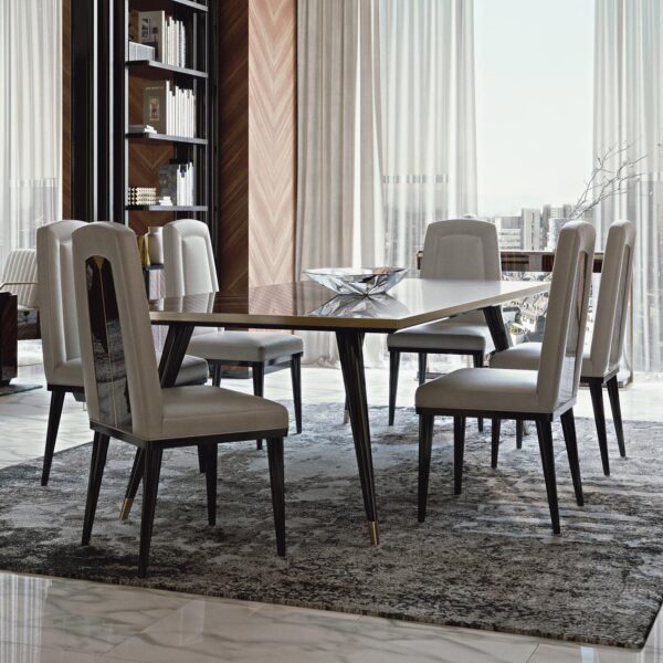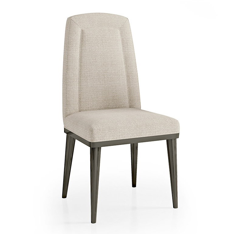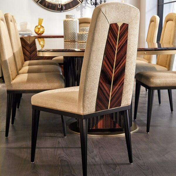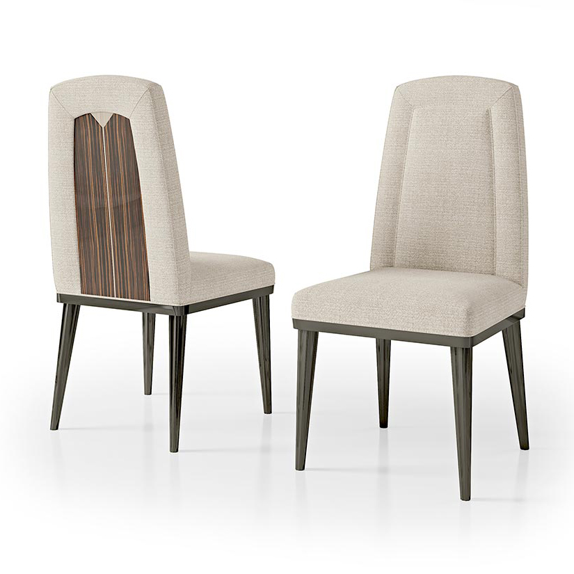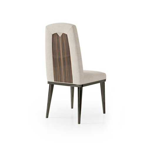 E20070 A charming addition to a vintage-inspired dining room, the Denice chair features Macassar ebony paneling with a high-gloss finish that enhances the natural beauty of the wood. Tapered legs in beech, the chair is upholstered in fabric with a subtle texture only visible up close, for a charming surprise.; 22″ x 24.4″ x 42.5″ h. Seat 19.7″ h.
