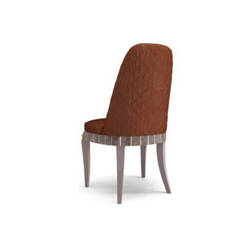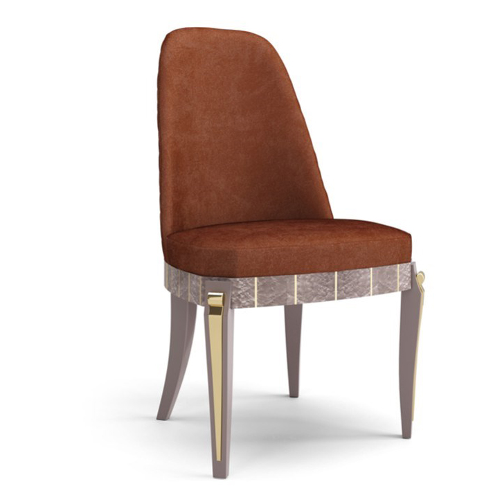 A20010 Thanks to its silhouette, the Genevieve chair will be an element that complements any dining table. The seat is veneered in bird’s eye maple briar and has a round shape with a squared front embellished with vertical inserts in gilded metal. The tapered wooden legs have a finish matching the texture of the essence and have a golden metal detail on the front. the upholstered part adds a finishing detail that gives glamor to this aesthetically appealing and functional furniture.