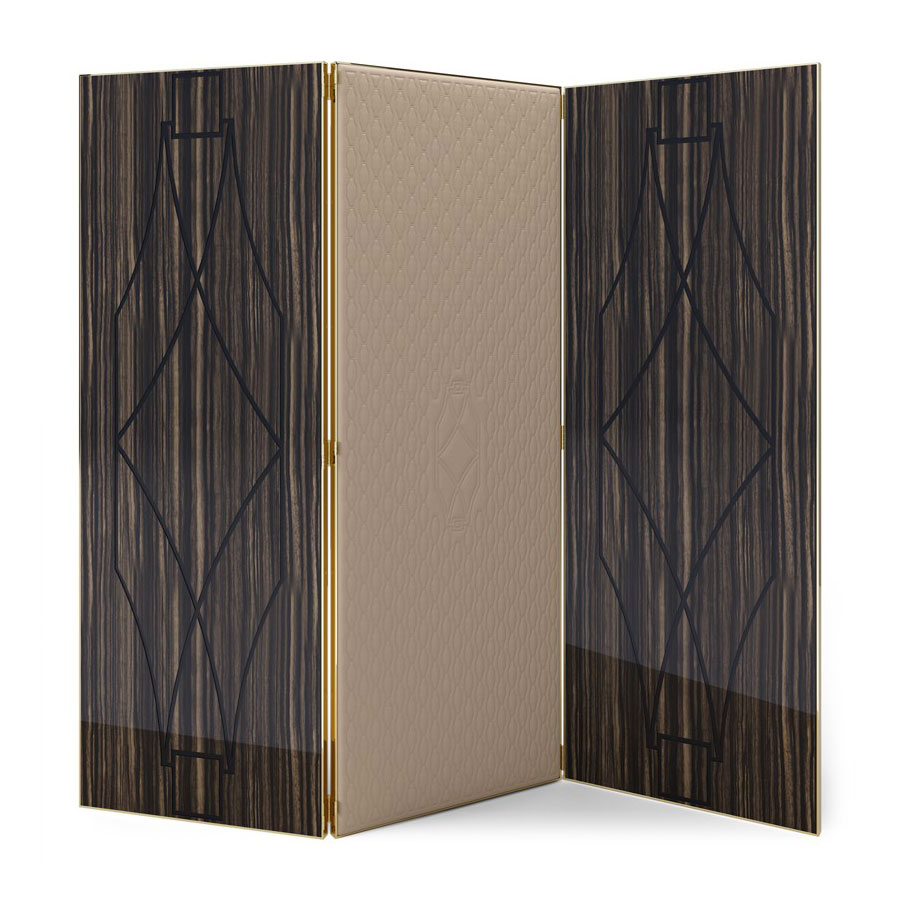 E03060 Evoking the glamour of the past with a modern silhouette, this elegant 3-panel screen has a vintage appeal that will complement both classic or modern decor. Framed entirely of polished brass, the side panels are crafted of Macassar Ebony with stylized engravings that recall the design on the central panel upholstered in quilted brown leather. Finished on both sides, the back is all in a neutral lacquered beige color. The mix of colors and textures creates a visually alluring piece that can be used as a room divider or purely decorative focal point.