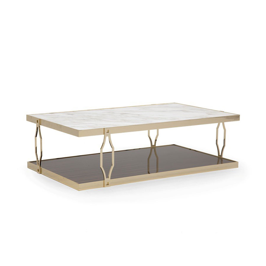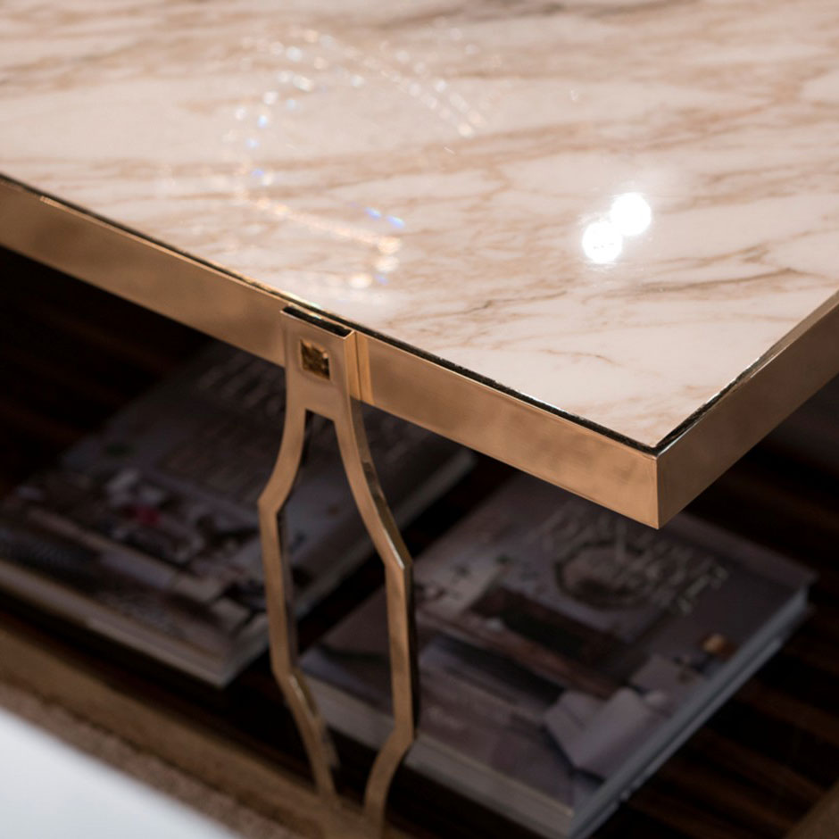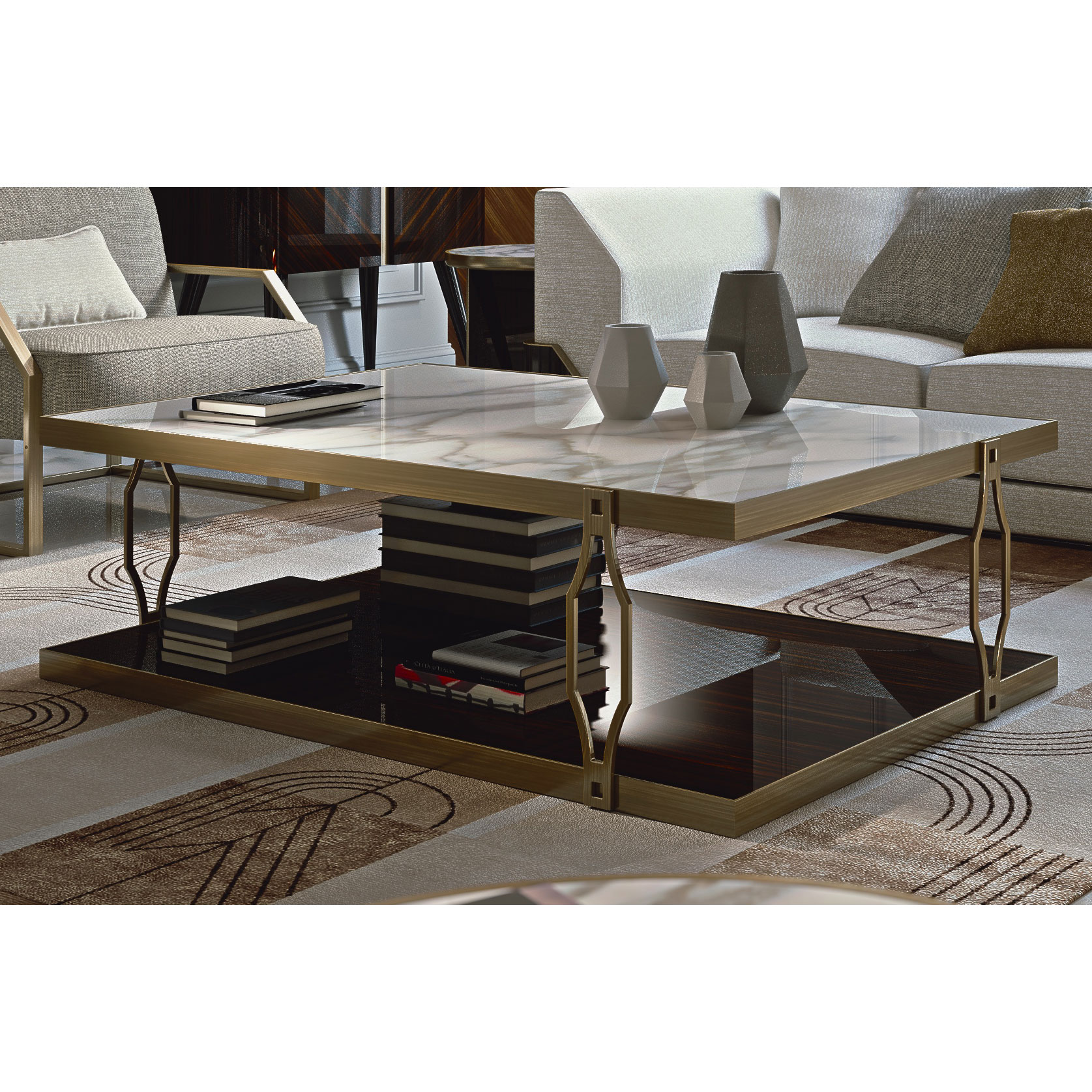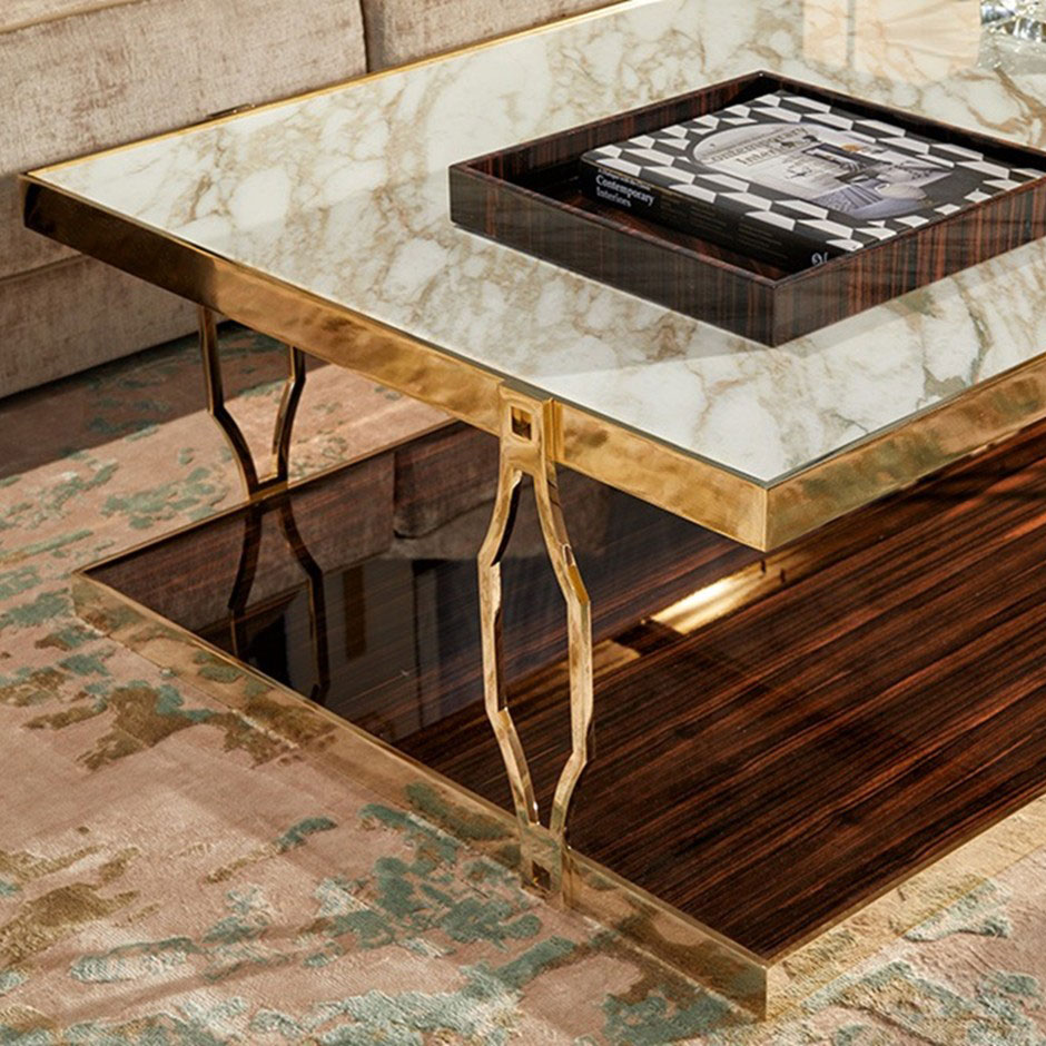 E03032 Coffee table in Macassar Ebony with Calacatta Gold marble and metal structure; 55.1″ x 35.45″ x 19.7″ h.