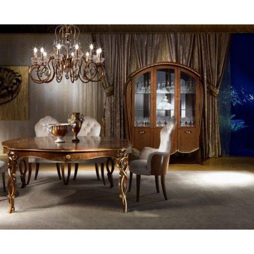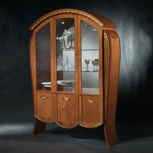 In walnut-dyed érable. The side elements that support the central body are inlaid and threaded in different precious woods. The central domed part has relief decorations covered in gold leaf. The doors are enriched with floral inlays in mother of pearl and different essences. Mirrored backdrop and crystal shelves.