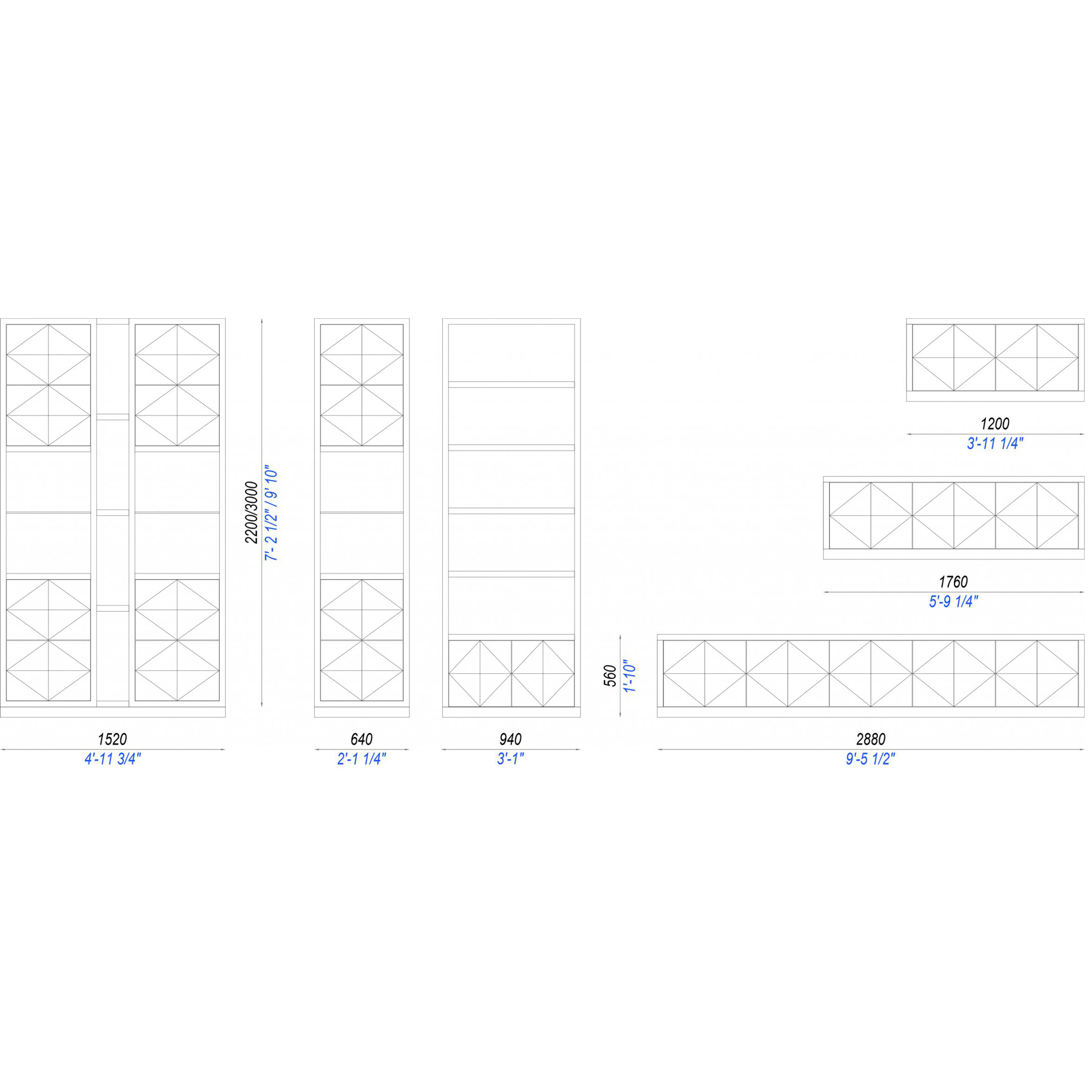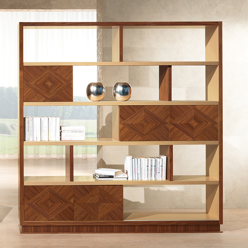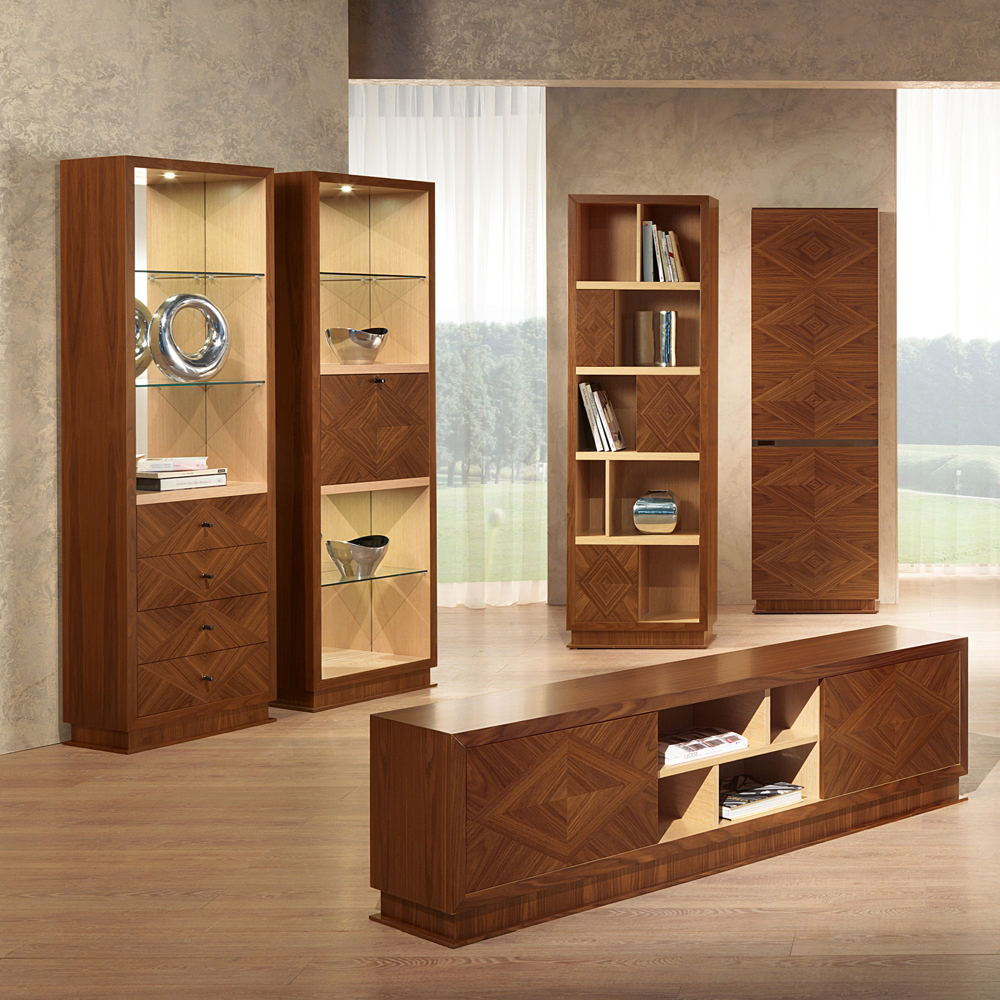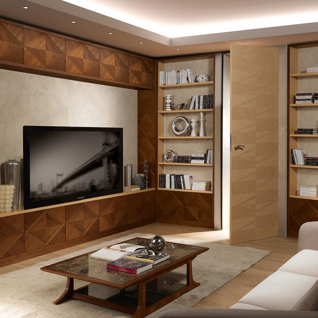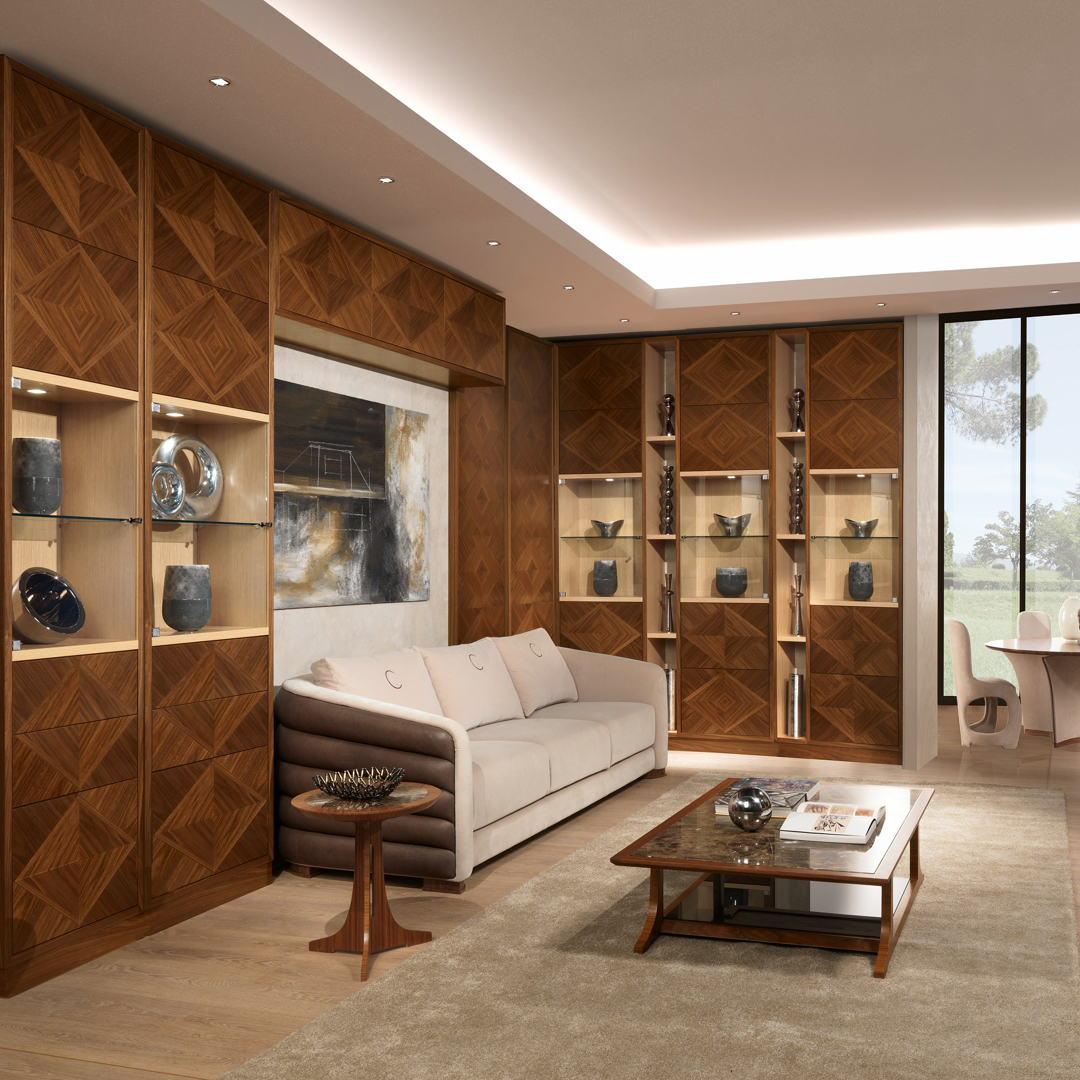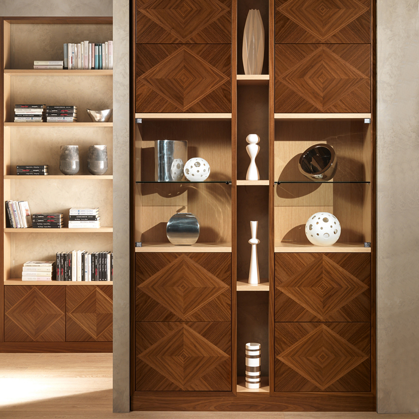Modular freestanding system for day time area. The frame and the doors are veneered in Natural Canaletta Walnut with geometric inlay of wood veins.