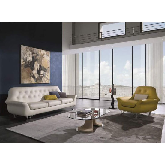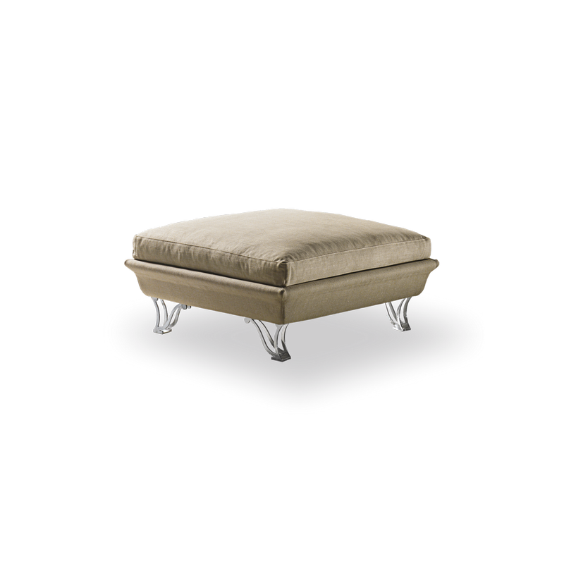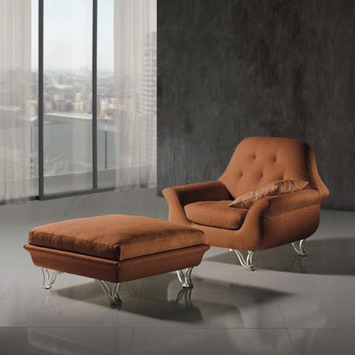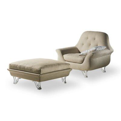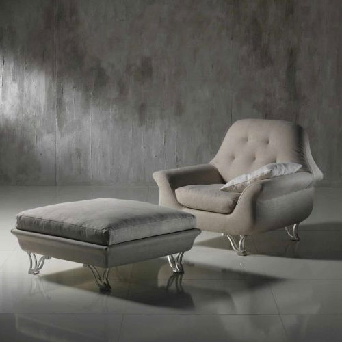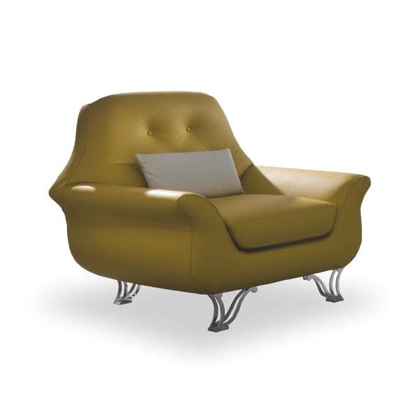 Armchair with wooden frame covered with a layer of polyurethane in different densities, metal feet available in chrome, brushed bronze and satin bronze finishes. Upholstery in fabric or leather.