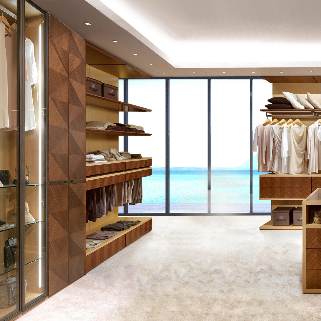 Modular walk-in closet with back wall-panels. Backs are veneered in natural oak. Shelves are veneered in natural oak and natural canaletta walnut. The fronts are veneered in natural canaletta walnut with geometric inlay of wood veins.