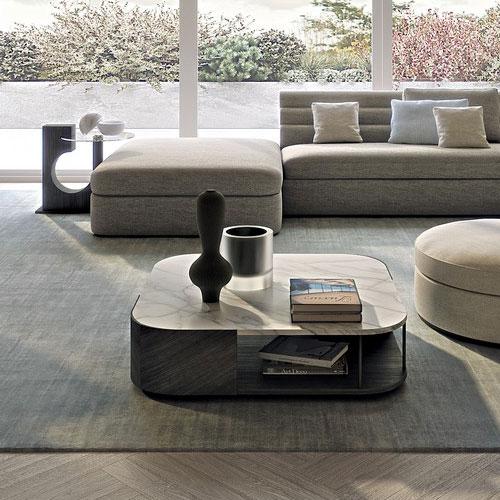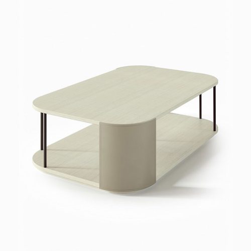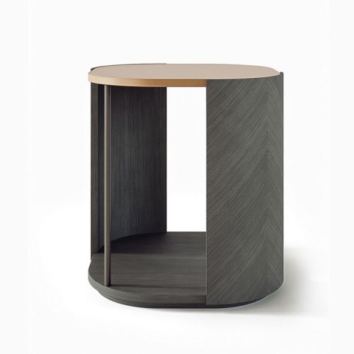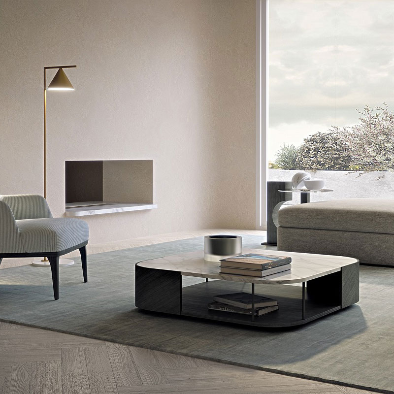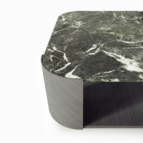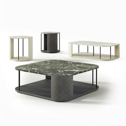 Series of coffee tables inspired by the Gae bookcase characterized by curved elements available in light Tay, dark Tay, Canaletta Walnut and leather. The top is available in different types of marble, wood and leather. Metal supports are avaiable in bronze-gold, lead and burnished finish.