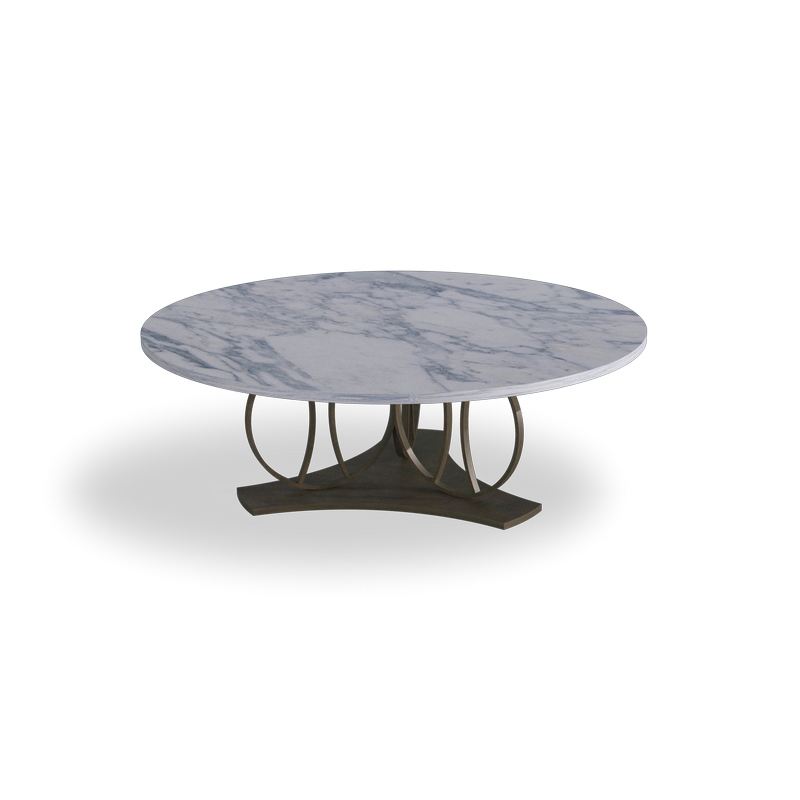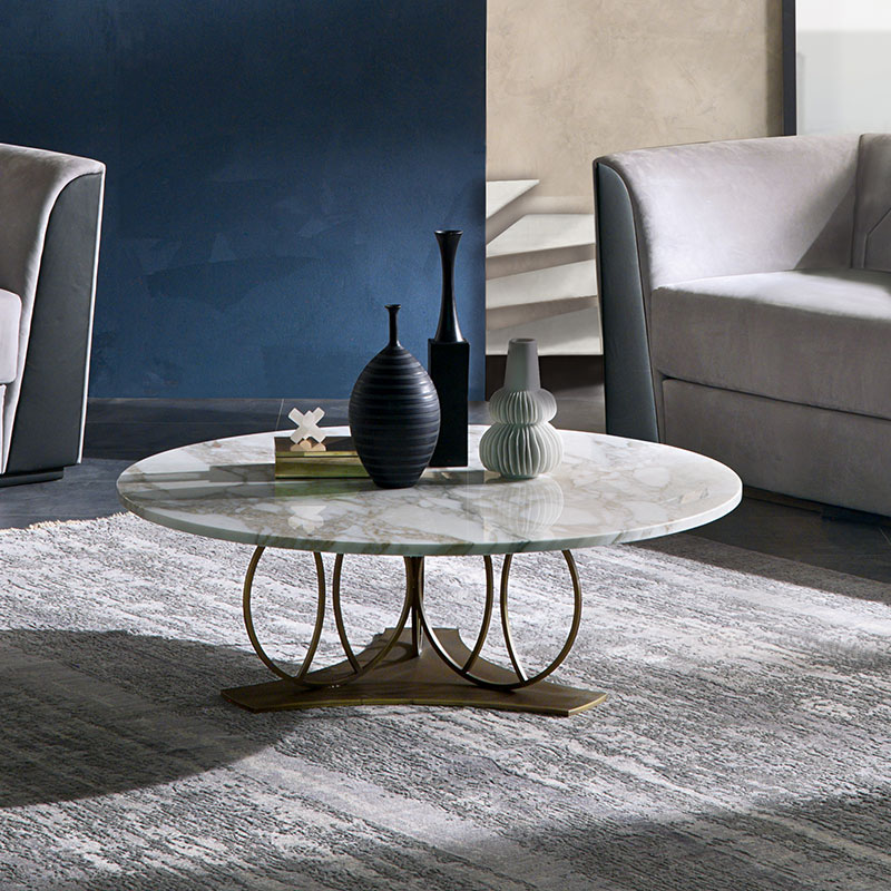 Round coffee table, available in two versions for the center of the living room and the sofa side. The original ring structure is in metal with a satin bronze finish (ME03). The top is available in bronzed glass (TL59B, TL64B) and in white Carrara marble (TL59, TL64).