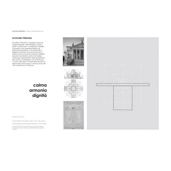 The coffee table pays homage to ”La Rotonda” by Andrea Palladio, considered universal model, pure representation of great dimensions and of mathematical beauty. Resuming what Palladio calls ”the three psycological virtues of architecture”: calm, harmony and dignity