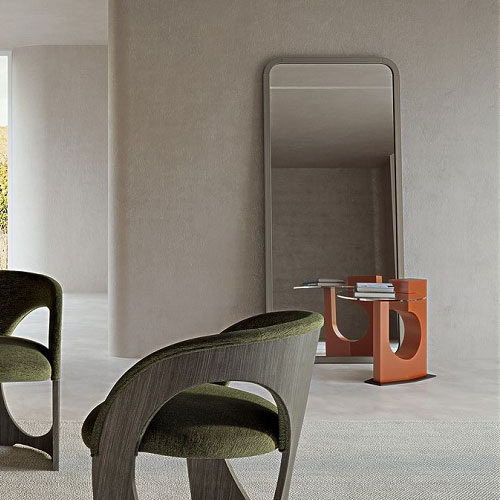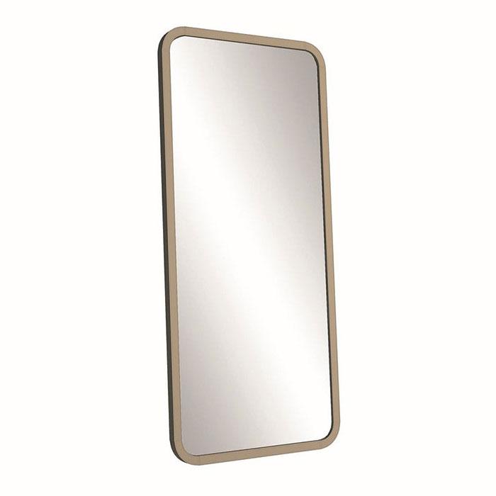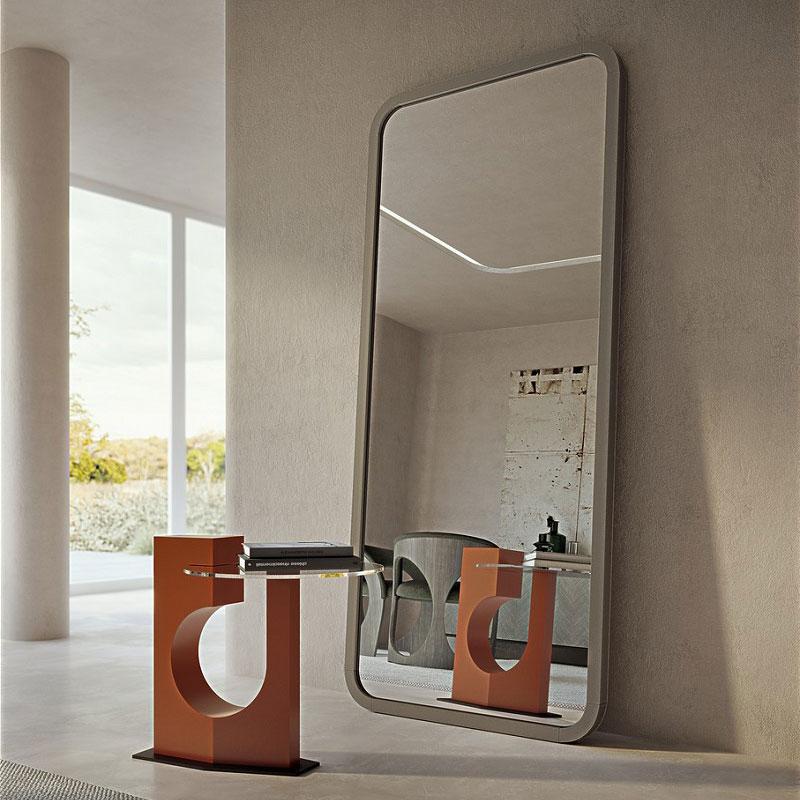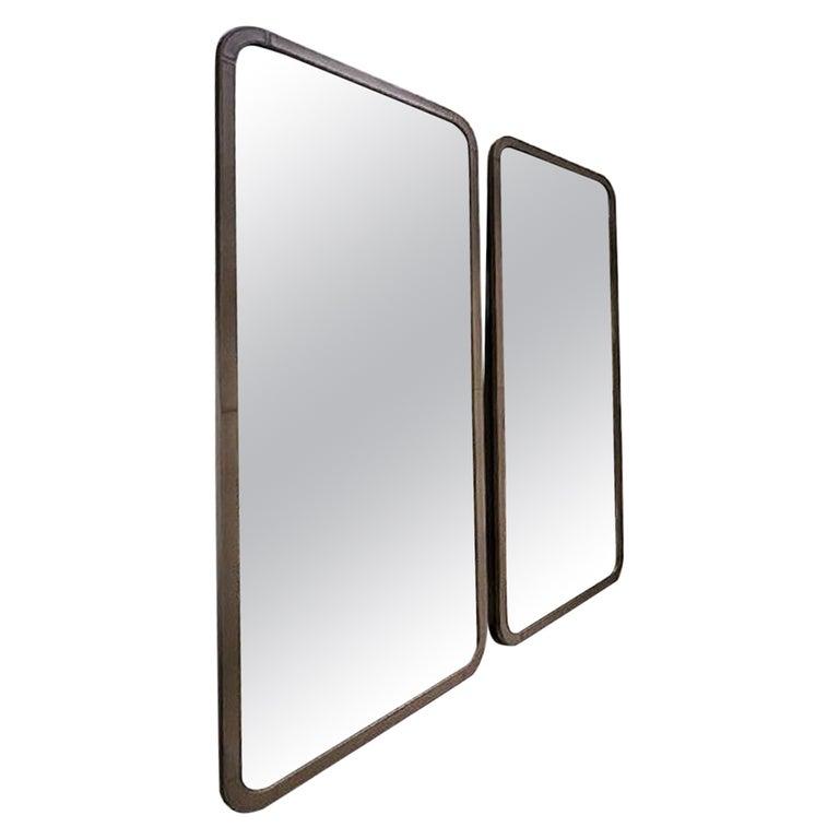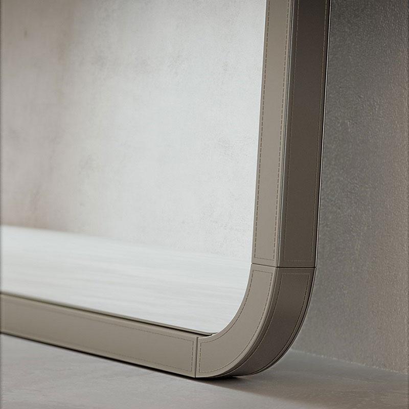 Rectangular floor mirror with rounded corners covered in saddle leather with stitching. Leather available in different colors.